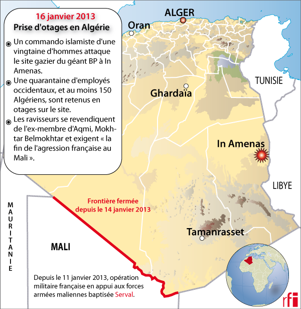C’était à prévoir : l’armée algérienne a attaqué hier soir les prises de position islamistes sur le site gazier. Fatalement, plusieurs otages sont morts des suites de cette intervention (une trentaine selon les dernières informations dont un français) et d’autres pourraient suivre vu que l’usine n’a pas encore été complètement reprise. A noter que parmi les ravisseurs djihadistes tués il y avait un français.