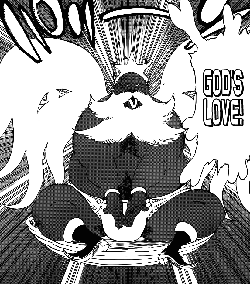 Ha, Kubo et la drogue : une belle histoire d’amour. Donc, en gros, il n’y a que la dernière page qui soit un minimum intéressante. Le reste n’est qu’un délire de fat cupidon en couche culotte obsédé par le fait d’avoir des fan girls de son coté. Et qui ne serait pas contre une partie yaoi avec Byakuya. Damn. Il est temps que ce manga se termine : Kubo n’a plus d’idées depuis un bon moment.