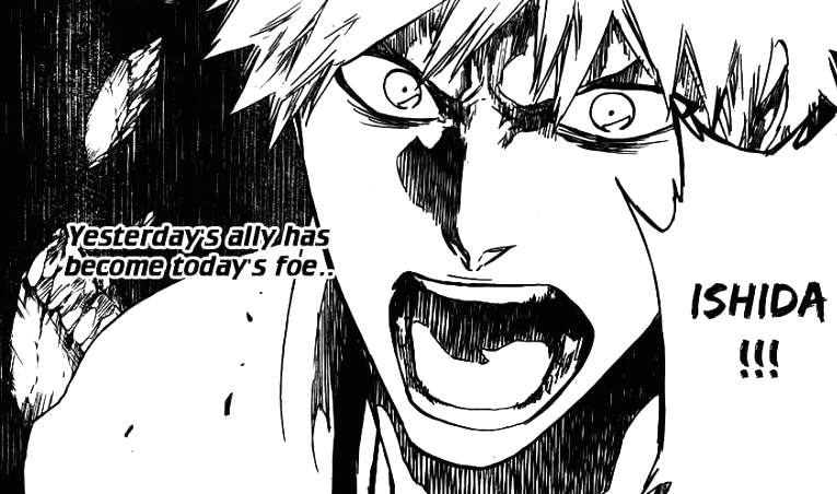 Très « Meh » ce chapitre. Ishida intervient et joue les bad guys mais on y croit pas une seule seconde. On apprendra, très probablement, quelques chapitres plus tard, qu’il a rejoint le camp de Juuha Bach pour mieux l’infiltrer de l’intérieur. « J’avais pas le choix Ichigo-Chan ToT C’était pour venger ma familleeeeee bouuuuuuuuh » Shut up filthy b*tch. Et puis qu’est-ce c’est que cette action totalement illisible ? Et ne parlons pas de l’entrée en mousse d’Ishida -_-