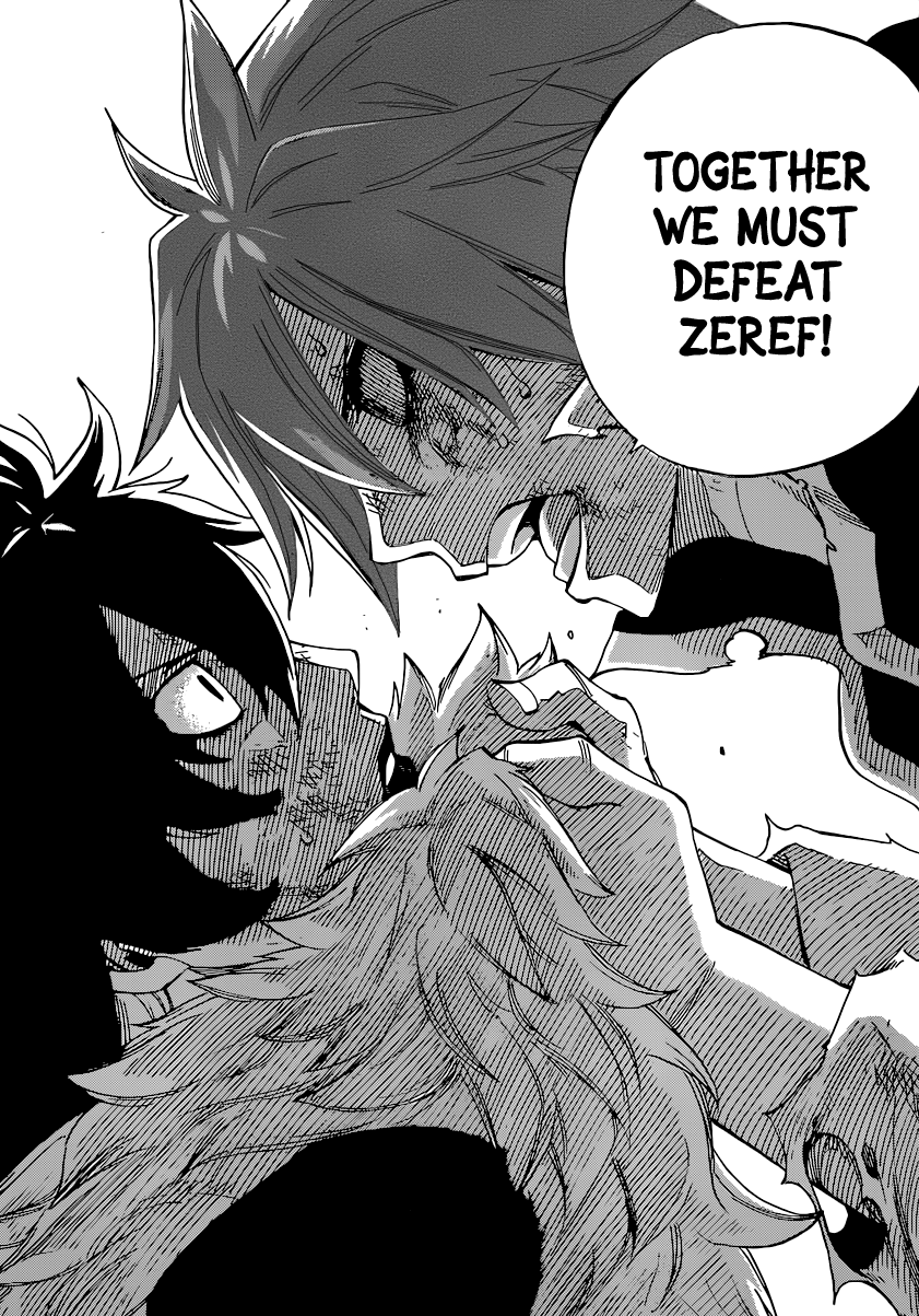 Bon chapitre qui se lit à une vitesse impressionnante. À peine a t-on l’impression d’avoir commencé que c’est déjà fini. Jellal n’est donc évidemment pas mort mais semble avoir perdu la vue ? Ça m’étonnerait que ce soit vraiment le cas mais bon, à voir. En tout cas, je suis bien content que l’imbécile d’ex-président se soit fait tué comme un moins que rien : il ne méritait que ça mwahahaha. Hâte de voir la suite des évènement maintenant que Tartaros a atteint son but !