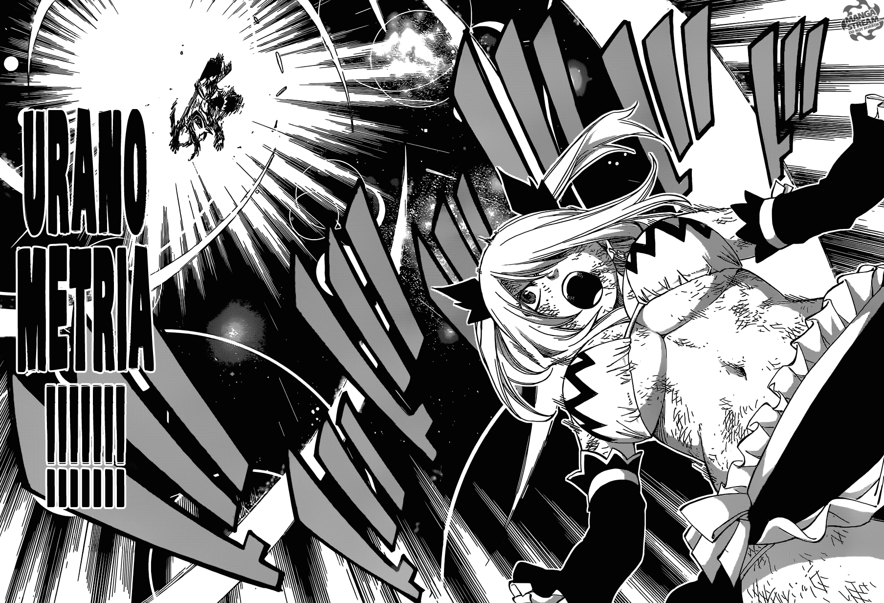 On revient à un chapitre plus conventionnel ici avec un cliffhanger qui rejoint la longue liste des « Sponsored by love and friendship » de Fairy Tail. Rien de surprenant donc : le méchant random, qui s’était déjà fait laminer une fois, se fait humilier une deuxième fois par Lucy et le roi céleste continue son combat contre le chef de Tartaros. Et on sait tous que ça va finir comme ceci : soit le roi ténébreux gagne (vu qu’il faut qu’il se fasse battre par un bonze de Fairy Tail), soit il y a match nul. Vivement la semaine prochaine (ironie).