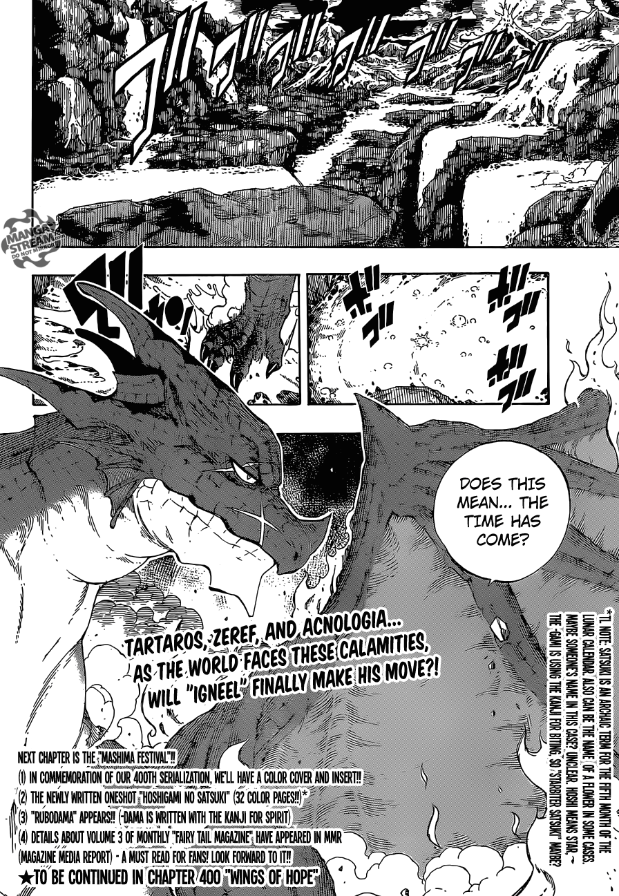 Whouhou ! On a eu pas mal de « bons » chapitres ces derniers temps avec Fairy Tail. Acnologia, Ignee, Zeref…ça commence à faire beaucoup ! D’ailleurs, il était pas censé être mort Igneel ? Je ne comprends plus rien moi. En tout cas, j’espère qu’on aura le droit à une bonne dose de badasserie et ce dès le 400ème chapitre (oui déjà). Je ne vais pas me mettre à attendre du drama vu qu’il n’y en aura pas. Par contre, j’aimerais bien que Guildartz fasse son entrée…c’est un peu le mage le plus puissant au monde (avec Makarov) et son aide serait plus que la bienvenue ._.
