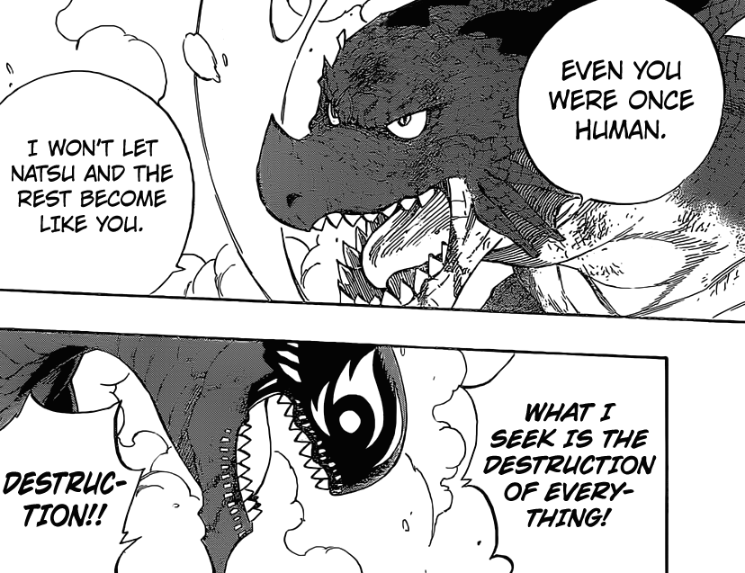 Même si on sait tous qu’il n’y parviendra pas vu que Natsu est son keupin \(^o^)/ Anyway, je me demande si on va finir par voir les DS se transformer en dragons (╹o╹) Et est-ce que ça voudrait dire que Igneel et co étaient également des humains ou est-ce que ça ne concerne seulement qu’Acnologia ? J’aimerais bien voir sa forme humaine d’ailleurs à lui… On y aura probablement le droit tôt ou tard hm !