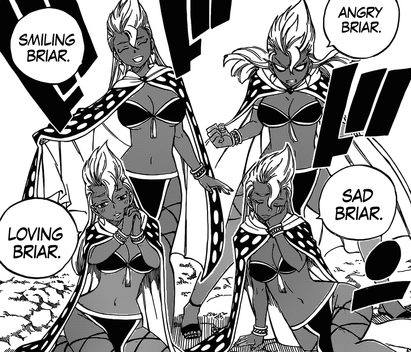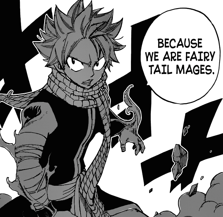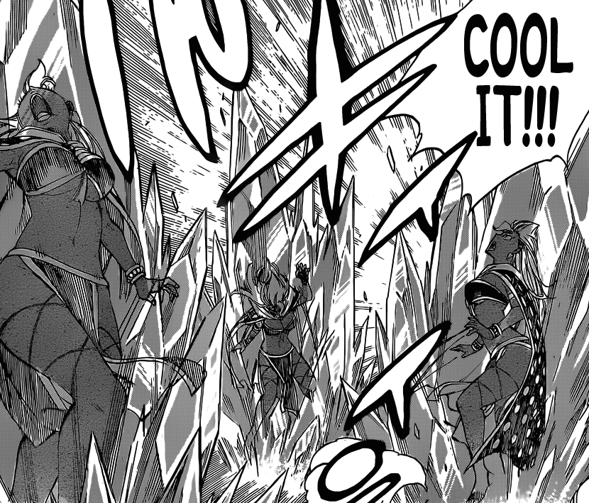 Chapitre très classique et donc très prévisible avec la décimation des membres d’Avatar un à un. Et Hiro a eu la très bonne idée de ne pas faire durer le suspens en accordant pas même un chapitre par gros bonnet d’Avatar. De fait, il ne reste désormais plus que leur chef qui, d’ici le prochain chapitre, se fera également bolosser. J’aimerais bien voir Gajeel en victimiser au moins un >__<