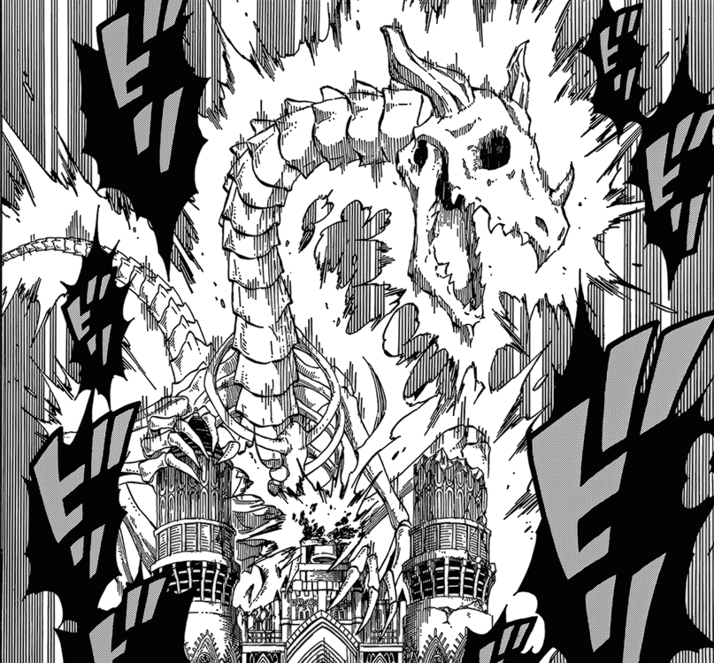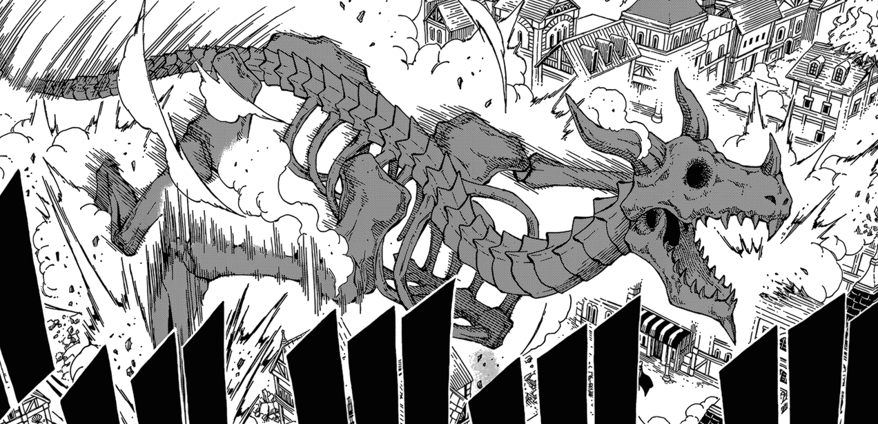 Arf, il ne se passe pas grand chose dans ce chapitre <_< En gros, Yuriy fait son autiste et se fait absorber par le pouvoir maléfique du « Tenrou Jade ». Lequel entreprend ensuite de contrôler un squelette de dragon histoire de détruire toute la ville de Magnolia. Heureusement, Mavis a un plan imparable pour sauver les habitants et Yuriy : le pouvoir de l’amour et de l’amitié (⌐■_■)