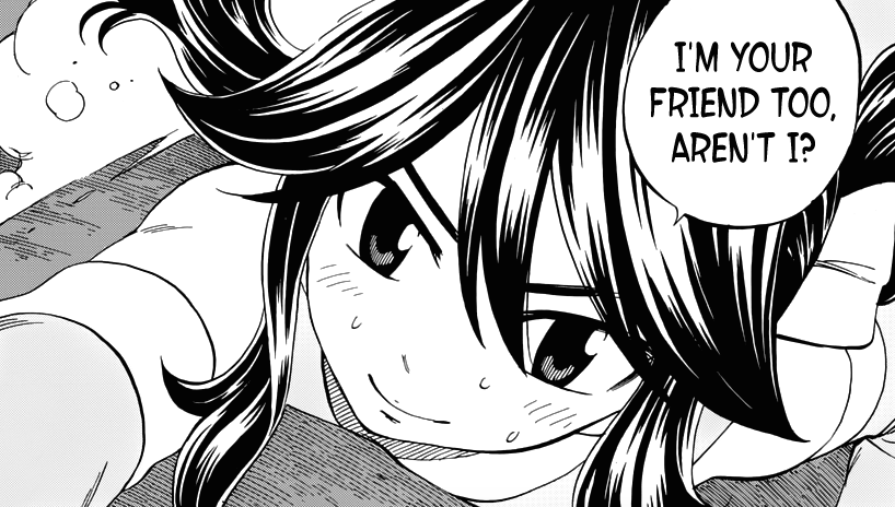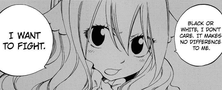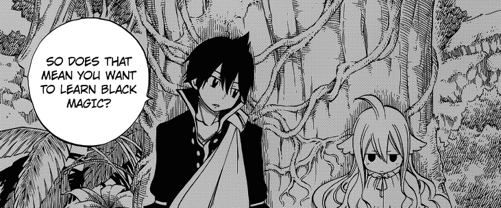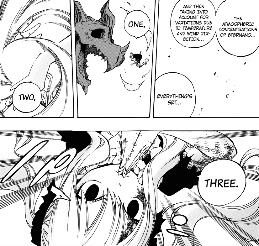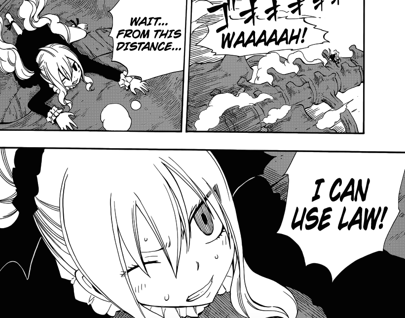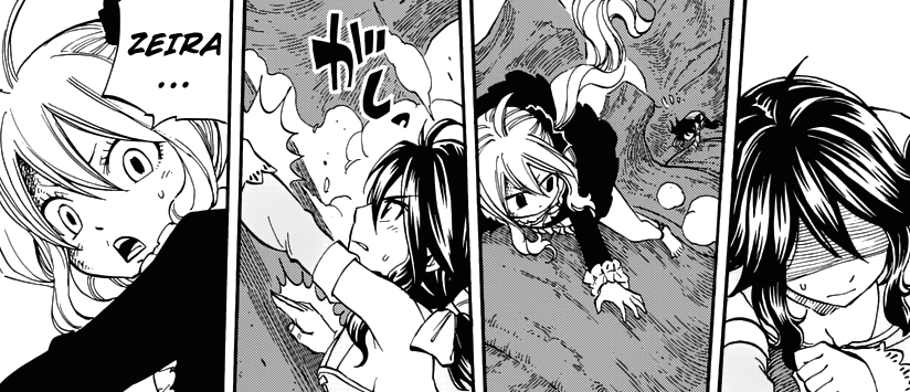 Voilà donc l’origine de « Fairy Law » \o/ Je comprends pourquoi Makarov avait, à l’époque, pu OS aussi facilement Jose Pora (l’un des Dix Mages Sacrés). Et dire que c’est Zeref lui-même qui en est à l’origine -_-‘ Ça permet, en tout cas, de réaliser à quel point Mavis est totalement dans la place. Même si activer ce sort, et sauver la vie de Yuriy au passage, semble l’avoir totalement épuisé. Pourtant, Zeira reste présente et, encore plus étrange, continue à réfléchir et parler comme si de rien n’était. Est-elle vraiment une illusion ?