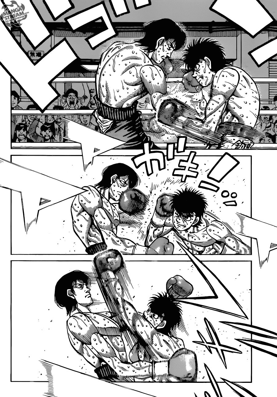 Chapitre de 7 pages ! Morikawa est en forme hehe. Blague à part, cela fait quelques temps que l’auteur est malade : ce qui explique les chapitres courts et les pauses. Souhaitons-lui bon rétablissement ! Quant au chapitre, purement orienté action, Ippo confirme son assurance en allant au contact d’un Gonzales qui, tant bien que mal, essaye de ne pas se faire dévorer par ce monstre de puissance. Vivement la suite !