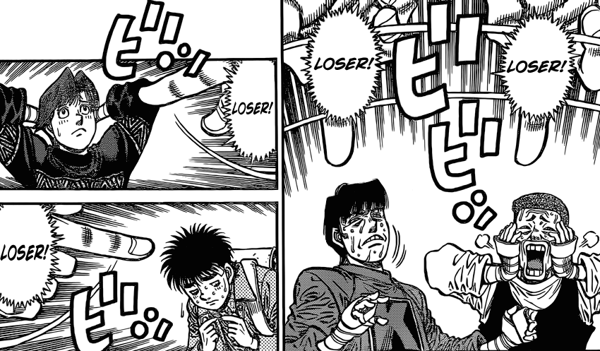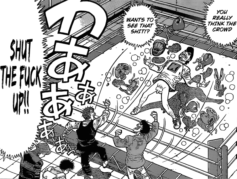 Ahhhh ça faisait longtemps qu’on avait pas vu Takamaru être un conn*rd complet xDDD Et c’est hilarant…horrible, mais hilarant. Anyway, si j’ai bien compris, ce match d’unification permettra à Takamura d’avoir sa troisième ceinture sur six. À moins que ça ne soit le match d’après ? -_-‘ BREF, vivement qu’on assiste à sa victoire annoncée car le club Komogawa en a bien besoin…