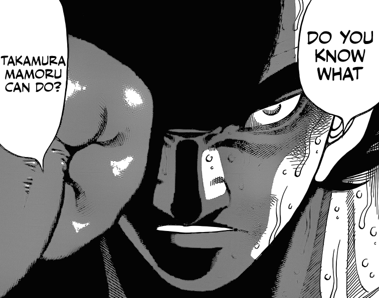 TAKAMURAAAAAAAAA *o* Bon, concrètement, il n’a RIEN fait du tout xD Mais son regard à la fin est tellement classe qu’on ne peut que rester béat d’admiration devant le champion incontesté de l’univers (⌐■_■) Oui, Bison est très fort et son style n’arrange pas du tout Takamura qui préfère combattre frontalement. Il n’empêche : Takamura reste Takamura. Et Bison n’a pas la moindre idée du danger que représente le monstre qui a battu son idole David Eagle.