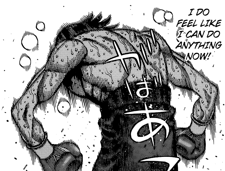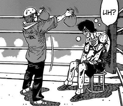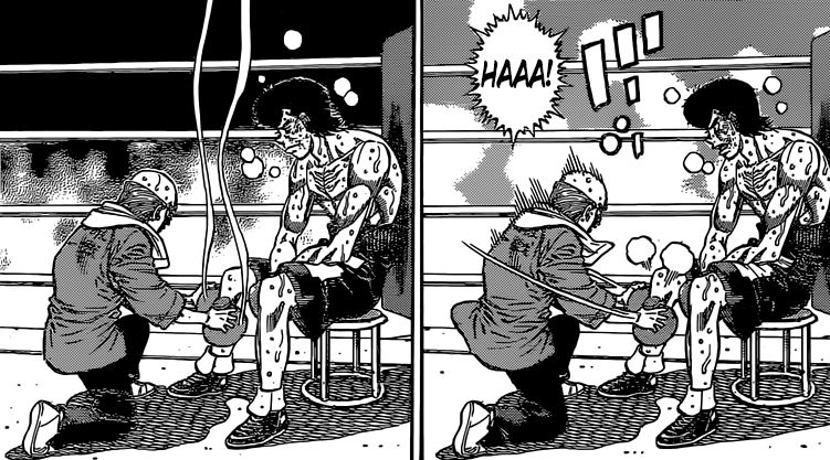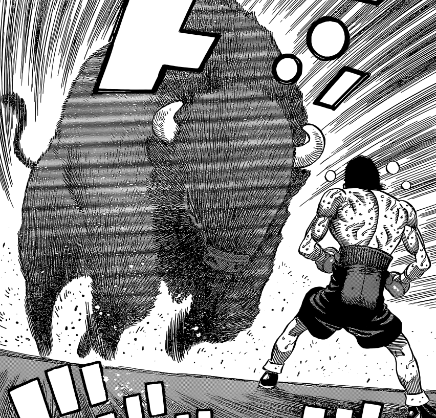 Certes, un boxeur qui ne peut pas compter sur la puissance de ses jambes pour propulser ses poings a déjà un pied dans la tombe. Mais ce serait sans compter le génie tactique du coach Kamogawa qui, grâce à son jutsu de guérison, a donné la force mentale nécessaire à Taka pour renvoyer le Bison dans son ranch (-‸ლ) Il n’empêche, c’est dingue cette manie qu’a Morikawa d’inventer toutes sortes d’handicaps à Taka histoire d’installer un tant soi peu de suspens <_< Ce combat aurait dû être bouclé il y a au moins quatre chapitres…