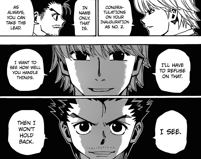 Comme d’habitude très bon chapitre alors qu’on reste en plein arc de transition. Ging est décidément un monstre de combat et Parriston risque d’avoir beaucoup de fil à retordre s’il veut prendre un jour l’ascendant. Leur relation me fait un peu penser à celle entre Batman (Ging) et le Joker (Parriston). À la différence près que Ging est beaucoup plus impulsif et « dangereux » que Batman qui obéit à de nombreuses règles en matière d’éthique. Vivement la suite u_u
