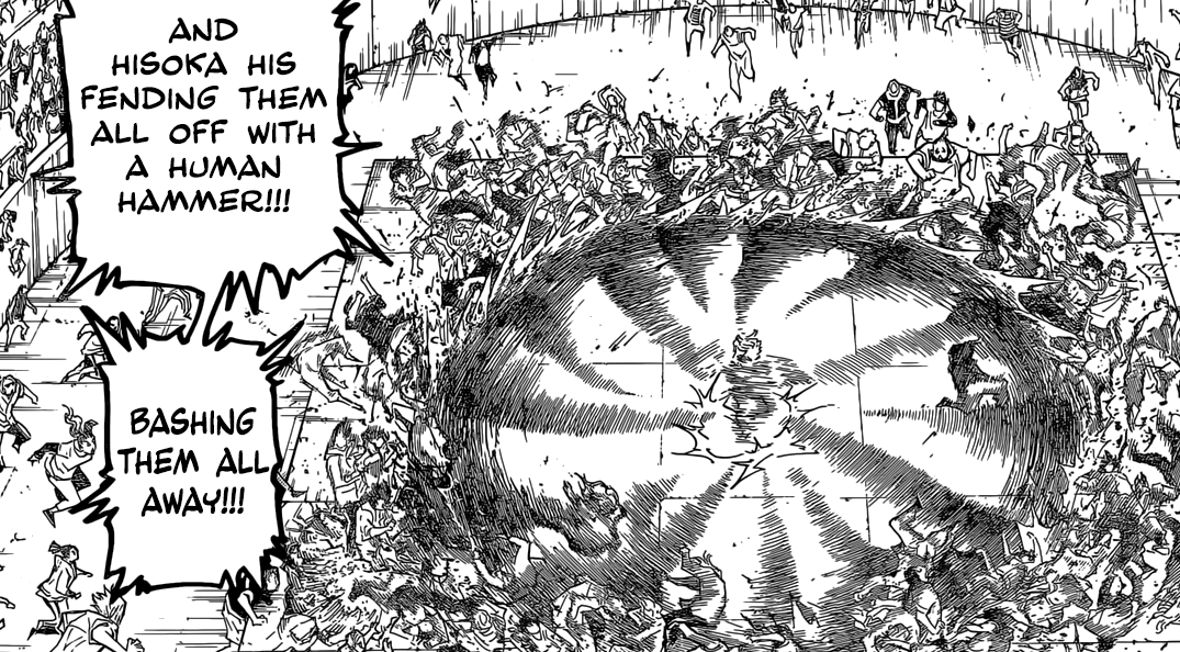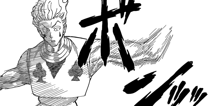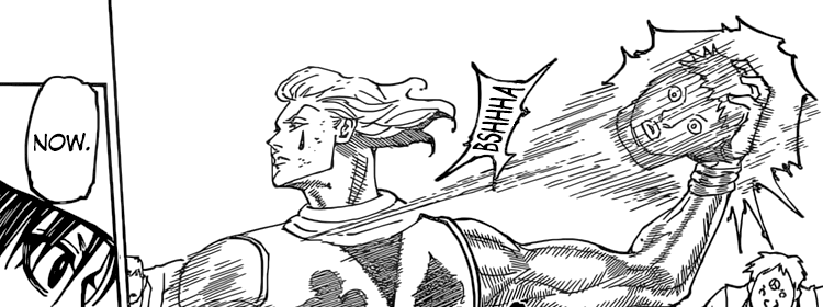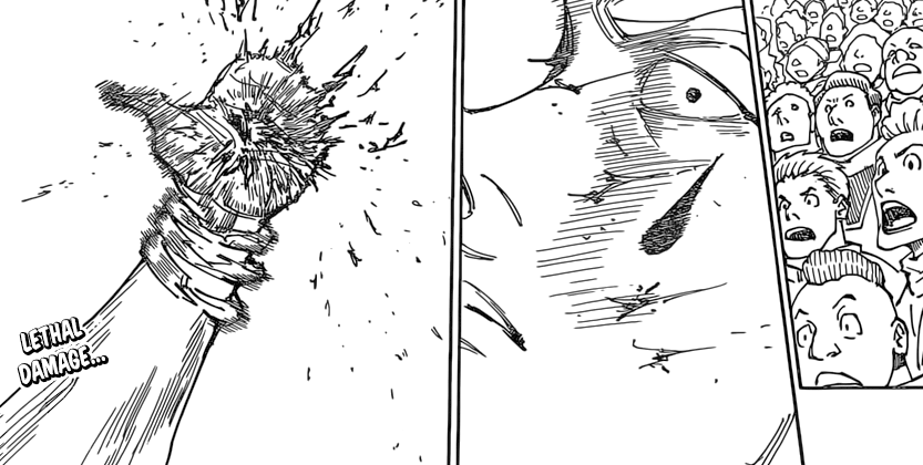 Well, Hisoka s’est encore fait avoir ._. Deux chapitres de suite et cela sans qu’il n’ait pu répliquer <_< Si je n’étais pas suffisamment adepte de la narration de Togashi, je dirais que notre ami est condamné à perdre ! Mais voilà, nous sommes dans Hunter X Hunter et TOUT peut encore arriver ! Tant bien même Hisoka vient de se faire exploser la main droite… Pourquoi n’a t-il pas anticipé l’éventualité que la tête qu’il trimballe depuis tout à l’heure puisse être affectée par « Sun and Moon » (qui permet de faire exploser n’importe quoi pour peu qu’on y impose les deux sceaux) ? Sachant que le sceau pourrait très bien se trouver sur le corps de la victime et non pas sa tête…