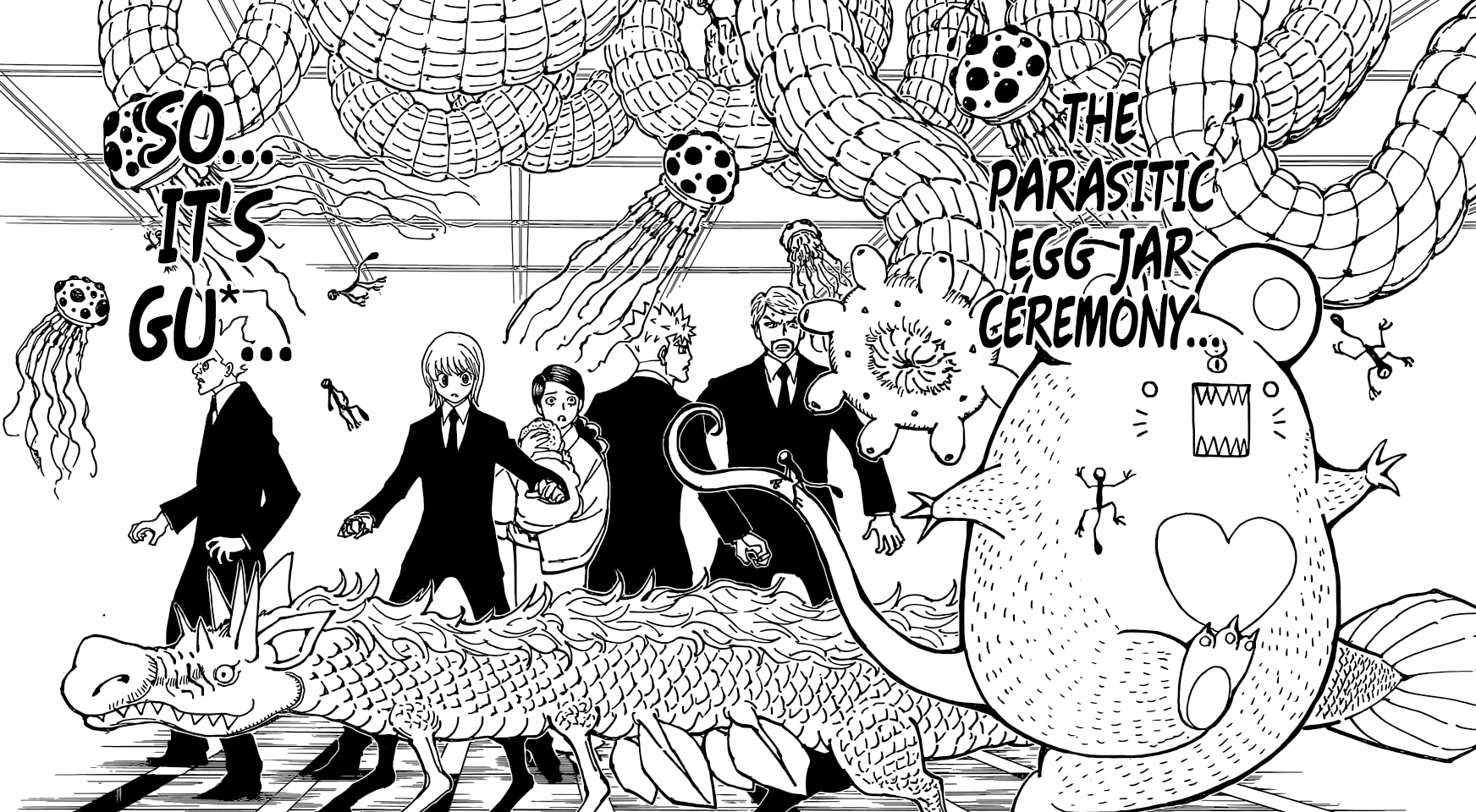 Et voilà…le dernier chapitre de HxH avant la pause maudite T_T YZ sera surement devenu une référence de l’actu d’ici là (⌐■_■) Il y aura peut-être même une chaine YouTube \^o^/ Anyway, ces bêtes de nen parasitaires, liées à la cérémonie d’intronisation ayant eu lieu il y a un mois de ça (en vu de la guerre de succession pour le royaume de Kakin), ont l’air redoutables O_O La preuve —> celles-ci sont parvenues à manipuler Sairid, qui manipule pourtant le nen, en lui posant une simple question !