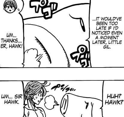 Et on débute par la paire Gilthunder/Hauser qui commence d’ores et déjà à power-up dès la fin du chapitre ! L’explication est d’ailleurs bien trouvée puisqu’il ne s’agit pas de montée soudaine en puissance mais plutôt d’un remaniement mental des pouvoirs en plus d’une future synchronisation en vue de vaincre ce dragon d’argile moche (╹o╹) Bref, vivement le training de Lord Hawk (⌐■_■) Je prédis un level au dessus des 1.000.000.