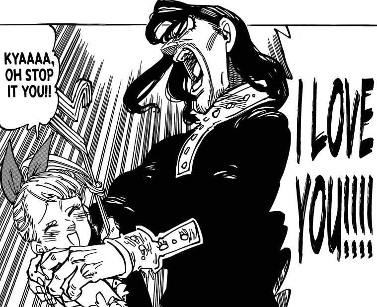 Et je dois dire que Nakaba Suzuki a fait un très bon boulot pour rendre attachant deux persos qui, pourtant, ne payaient pas de mine au chapitre précédent. Par contre pour Waiyo, je crois qu’il est un peu trop moche pour que je puisse le trouver un jour charismatique xD Et comme si cette bataille ne se suffisait pas à elle-même, l’histoire embraye directement sur le retour ô combien attendu de BAN SAMA *o* Aka mon perso préféré de Nanatsu avec Melodias, Merlin et Lord Hawk <3 Allez là !!!