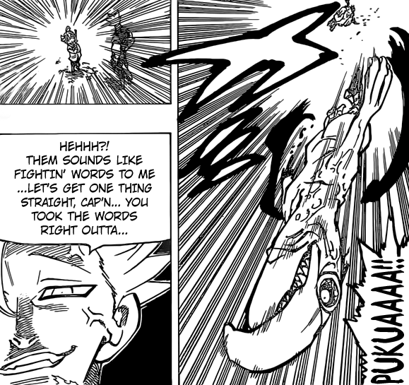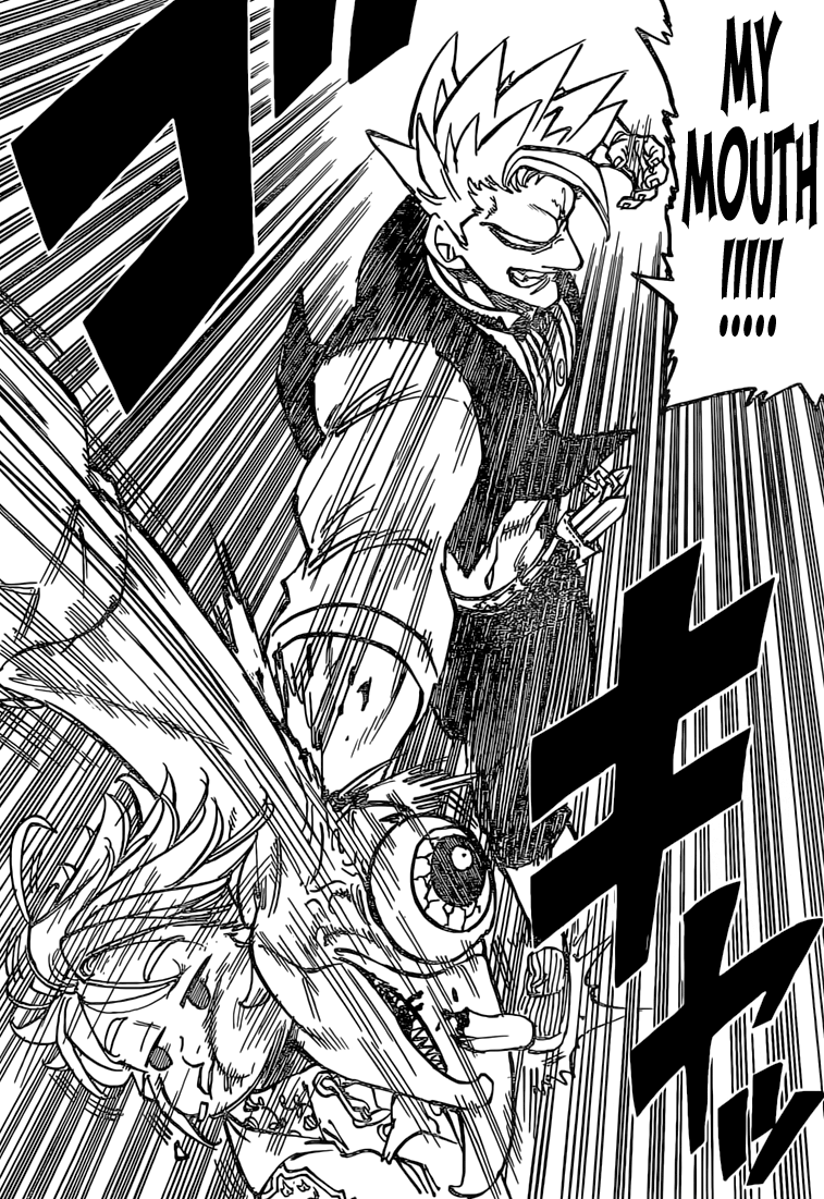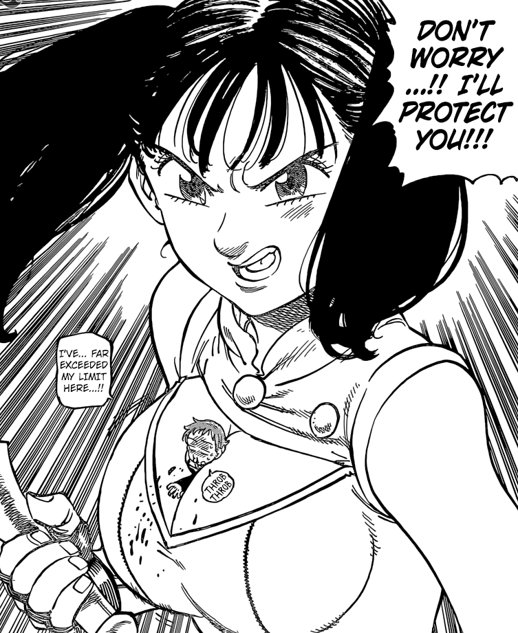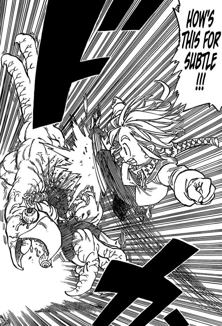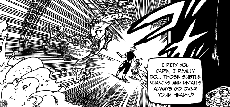 Ce chapitre en or xD C’est l’une des raisons qui font que Nanatsu no Taizai est aussi apprécié —> son sens cultissime de la comédie qui n’a pas à pâlir face à l’autodérision d’un One Piece. Voir Ban et Meliodas se quereller et anéantir leurs ennemis sans même s’en rendre compte —> priceless xDD De quoi témoigner de leur incomparable puissance. Ce qui me laisse à penser que Ban est bel et bien parvenu à absorber une partie des pouvoirs de Galan lors de leur duel. Car son power-up ne fait désormais aucun doute.