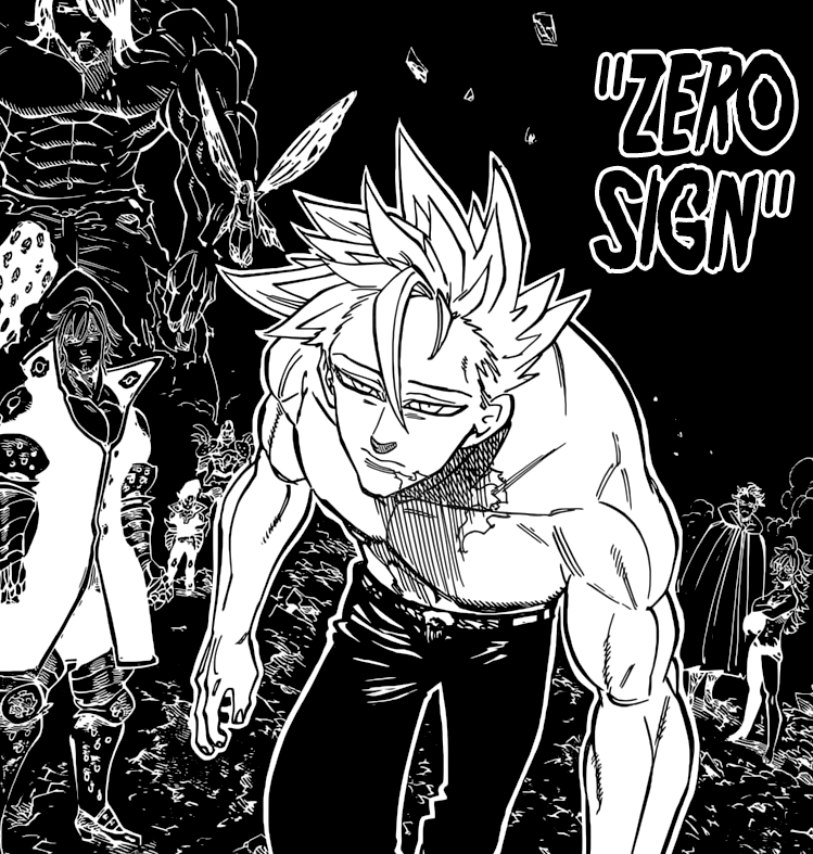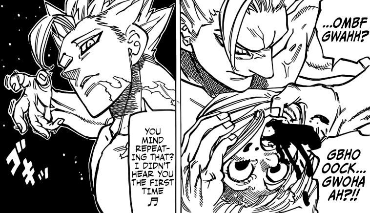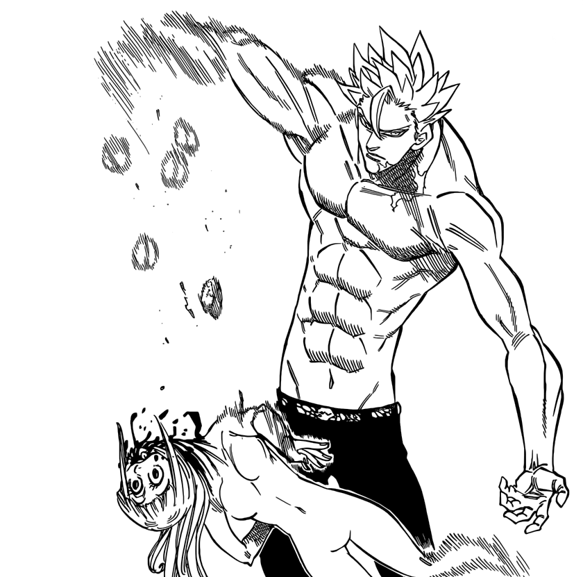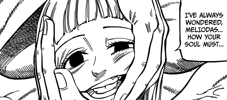 Ce qui donne du plus petit au plus grand : Zeldris —> Estarossa —> Meliodas ! Et allez savoir pourquoi, Estarossa a eu une croissance normale alors que Meliodas s’est figé dans sa forme d’enfant… Anyway, tant bien même l’arrivée d’un Deus Ex Machina était prévisible en soi, je ne m’attendais pas à ce qu’il s’agisse de Ban ! Et cela de manière hyper badass qui plus est vu qu’il terminant ENFIN Merascylla ! À cet égard, l’acte est d’autant plus beau que sa mort entraine celle de Elaine (•︵•) Et où se trouve Elizabeth ? On ne l’a pas vu de tout le chapitre…