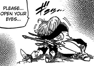 Pour autant, les faits sont là —> Meliodas et Ban viennent de se faire tuer par Estarossa O_O Reste à savoir comment ils seront ressuscités. Elisabeth va t-elle activer un nouveau cheat code des Déesses histoire de ramener à la vie nos deux comparses ? Ou bien Elaine va t-elle puiser dans ses dernières ressources et venir en aide à Elizabeth pour faire revenir à la fois Meliodas et Ban ? Je miserai sur cette théorie ! Sachant que Elaine est condamnée à disparaitre maintenant que Merascylla n’est plus de ce monde (•︵•) Damn, vivement la semaine prochaine T_T Le suspens est INSOUTENABLE !