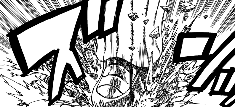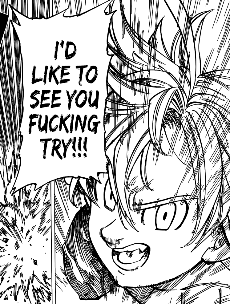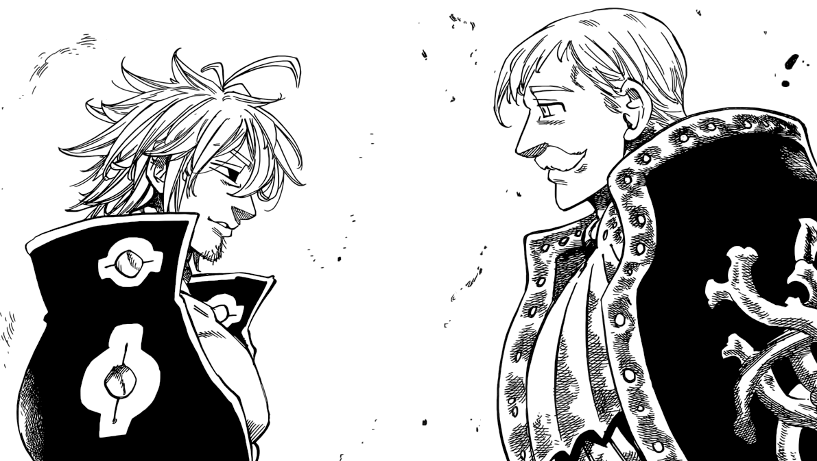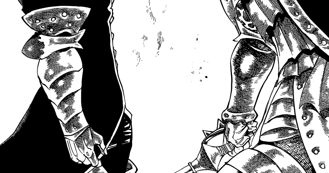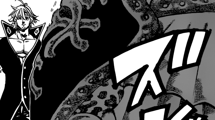 Pour peu que Nakaba ne fasse pas du faux teasing et n’interrompe le combat au bout d’un chapitre ou deux ! Sachant qu’il est évident que ce combat n’ira pas à son terme —> Estarossa est un ennemi beaucoup trop important pour mourir aussi tôt. Ce qui serait sympa serait qu’il s’apprête à se faire exécuter par Escanor et que l’un des Ten qui l’accompagnent ne se sacrifie à sa place ! Ça permettrait à Meliodas de prendre sa revanche ^_^ D’ailleurs, on apprend que son immortalité lui a été conférée…par son père, le Roi Démon O_O Je n’ose même pas imaginer son niveau de puissance…