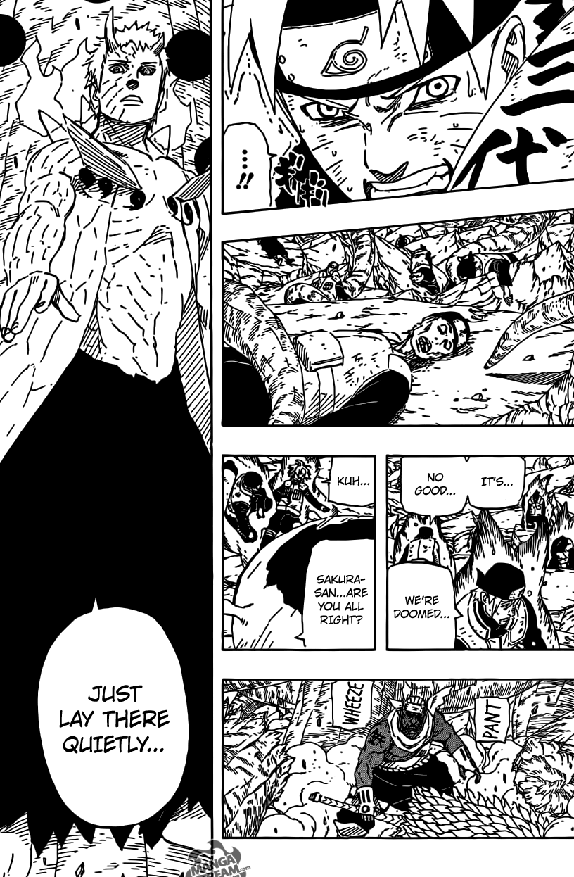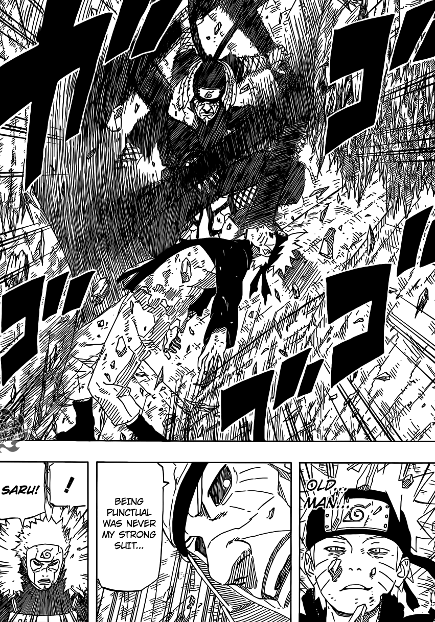 Ce n’est qu’ensuite que le Juubi se réveilla et déchaina sa colère dans le monde : le fruit sacré, son pouvoir même, ayant été violé. Ce qui se passe aujourd’hui n’est qu’un rappel à l’ordre des choses : l’être humain, et lui seul, est responsable des conflits sur terre. Ainsi, pour Naruto et l’ensemble de l’armée ninja, la fin semble désormais toute proche. Vivement la suite u_u