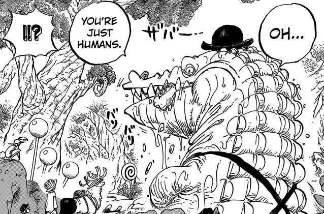 Depuis maintenant plusieurs semaines, je n’arrive plus à trouver d’intérêt à One Piece (•︵•) La quête de Luffy au sein de Cake Island en vue de retrouver Sanji ne m’enthousiasme guère ._. Alors je fais défiler les pages en espérant qu’on embraye rapidement sur une nouvelle phase narrative -_- En attendant, ni l’infiltration sous-marine de Brook et Pedro, ni les aventures de la Team Luffy à même les « Bois Enjôleurs » ne parviennent à capturer mon intérêt. Et dire qu’on se tape une nouvelle pause la semaine prochaine -_-