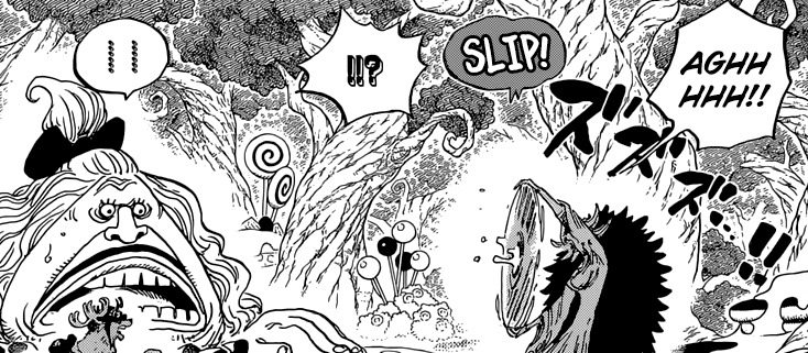 Hmm ! Si je comprends bien, le grand ahuri enterré à moitié dans le sol est l’ex-mari de Big Mom…et le père de Lola ! Sachant que sa soeur jumelle, Charlotte Chiffon, est désormais mariée à Al Capone >_< Avec lequel elle a eu un fils /OoO/ Et bien, et bien ! Que de révélations ! J’imagine que cette découverte va enlever une belle épine du pied à Nami vu que Lola est sa BFF depuis l’arc Thriller Bark xD Qui plus est, notre navigatrice nationale possède une vivre card de Lola ! Je crois qu’il est temps de l’utiliser…