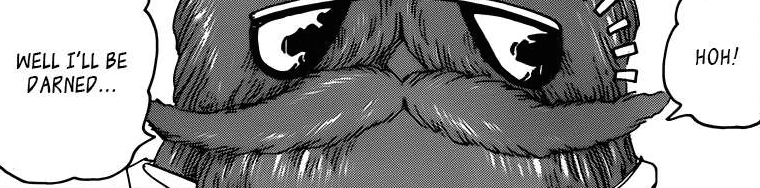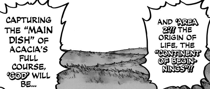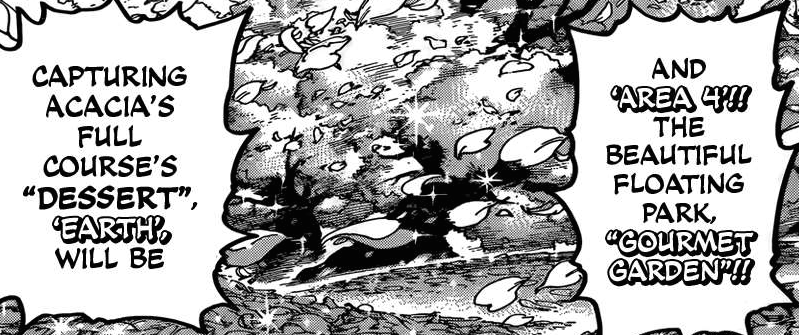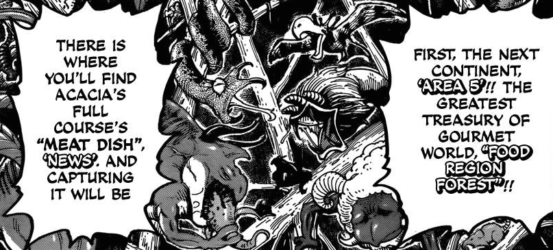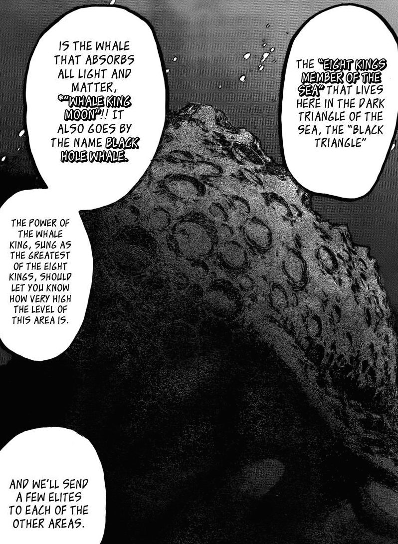 Niceeeeeeeee (-‸ლ) Au lieu de dédier 20 à 30 chapitres pour chaque plat du menu d’Acacia, comme cela avait été le cas jusqu’à présent, il semblerait que nos héros, sur les sages conseils du « Gold Chef » Jiji-San, aient décidé de faire fonctionner le saint modèle de la redistribution des tâches. La majorité des cuisiniers d’élite, dont Komatsu, se concentreront ainsi sur la capture de « Another » précieusement gardé par l’un des huit rois en personne (apparemment le plus puissant) : Le Roi Baleine de Lune (⌐■_■)