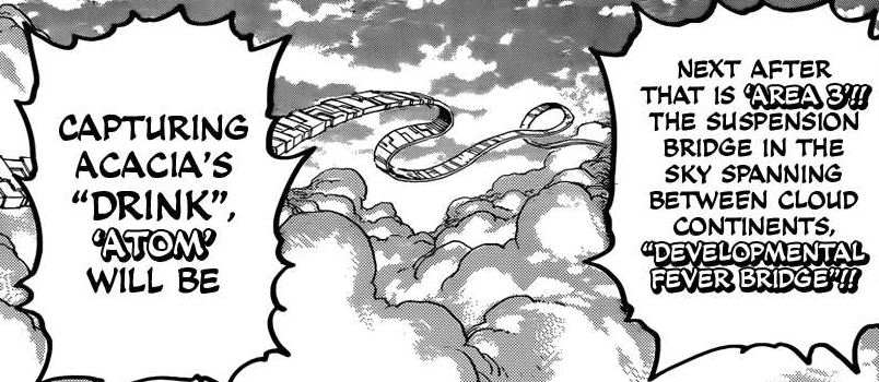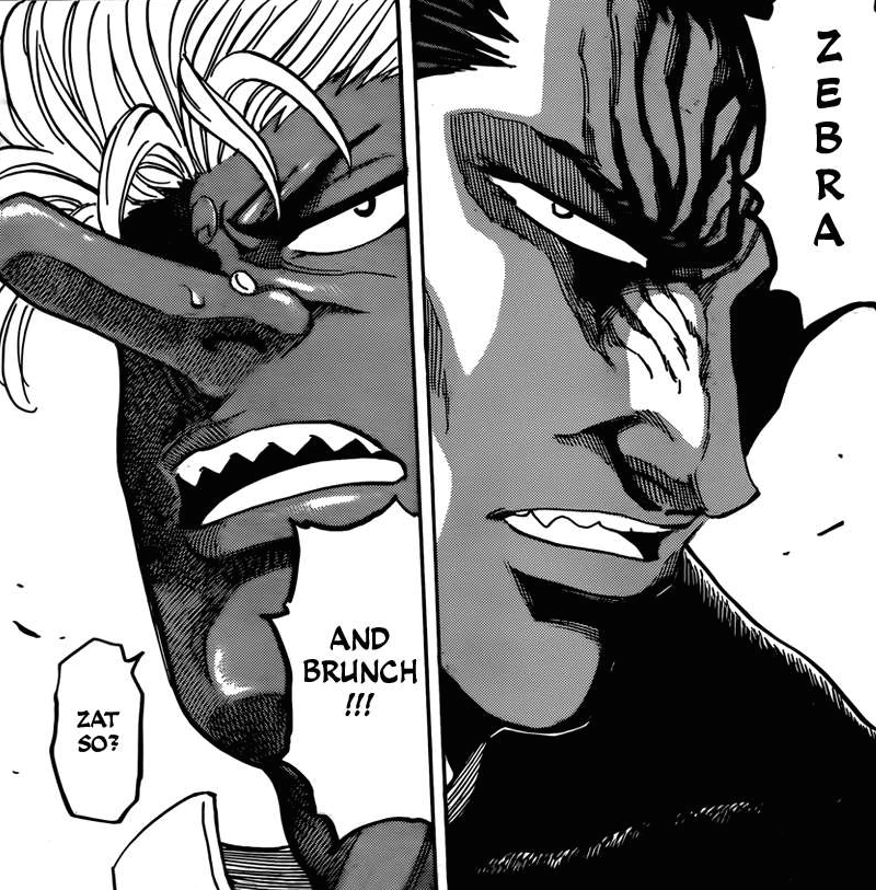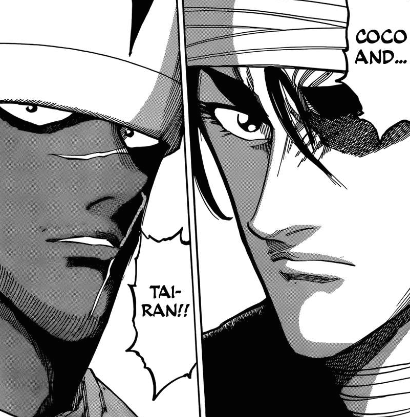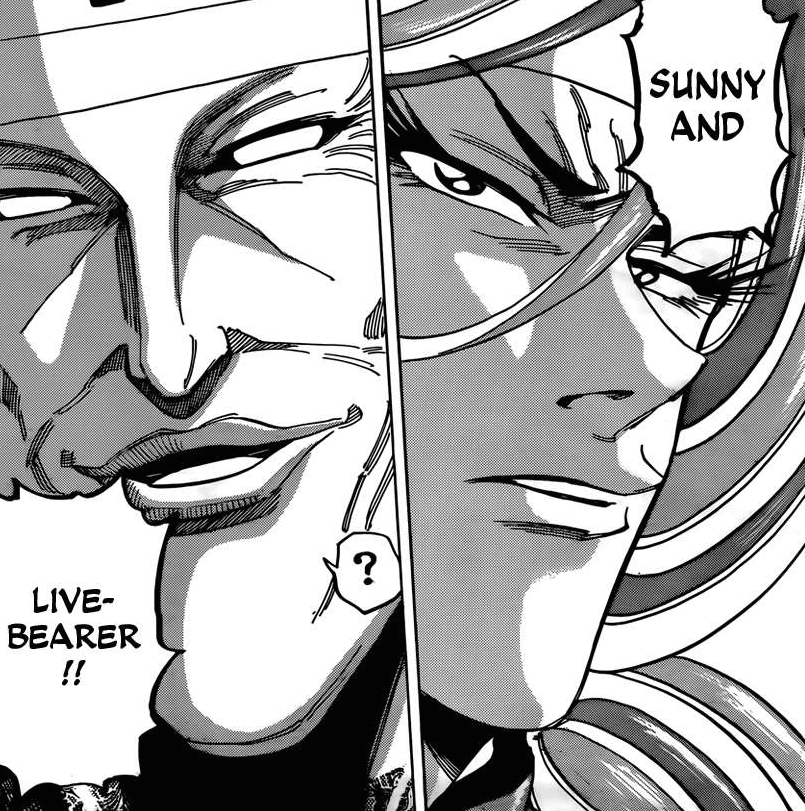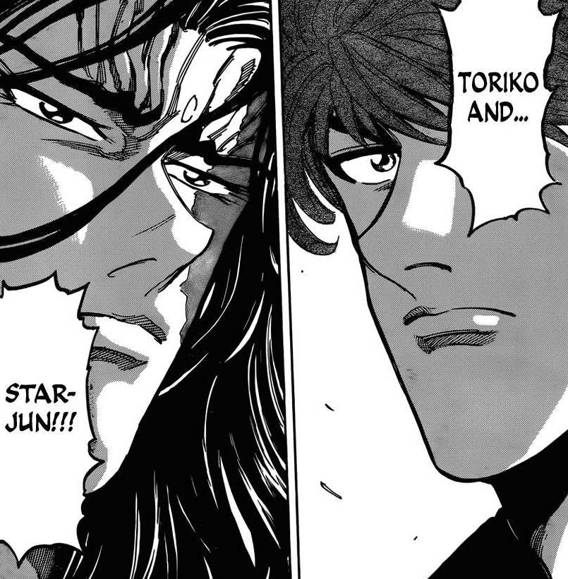 Quid des autres menus ? Ceux-ci seront réservés à un tandem de cuisiner aussi puissants que complémentaires dans leurs domaines respectifs. Pour la capture du dessert « Earth » de l’arène 4, Sunny et Livebearer devront apprendre à mettre leurs différents de coté et se concentrer sur ce qui les unit. En ce qui concerne la capture de la boisson « Drink », il conviendra d’associer les talents d’empoisonneur de Coco et de Tairan ! Ensuite, pour le précieux plat de viande « News », Zebra retrouvera son vieil ami Brunch :3 Enfin, le plat principal « God » sera réservé à…Toriko et Starjun !!! Les deux ennemis d’alors réunis pour une cause commune *O* Hâte de voir tout ce beau monde à l’oeuvre huhuhu.