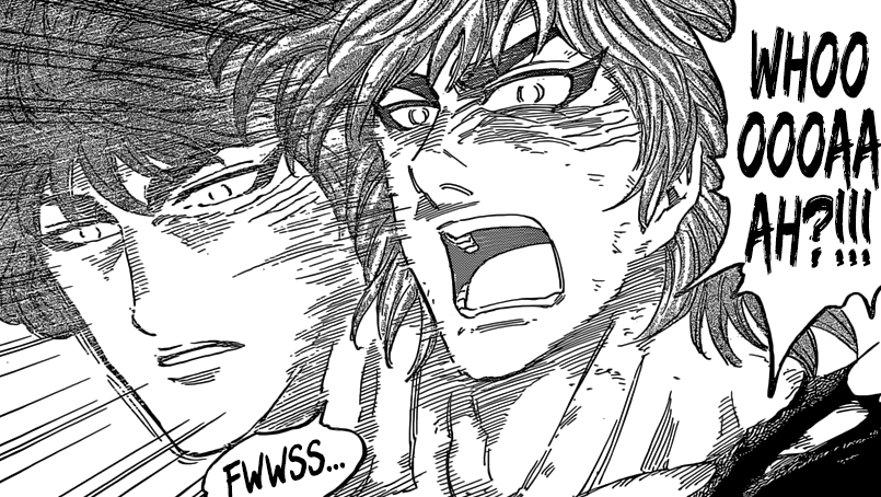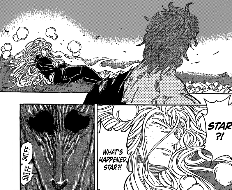 Sur ce chapitre, aucun frisson malgré l’apparition des démons gourmets hors des corps de Starjune et Toriko. De même, l’attaque du Roi Loup sur le parasite d’Acacia n’impressionne pas autant que celles de ses confrères. Souvenez-vous de l’expulsion d’air d’Heracles prompte à engendre des cratères béants à même le sol. Rappelez-vous la facilité confondante avec laquelle Bambina OS les quatre rois célestes ! Et que dire du regard de la mort du Roi Serpent X_X À coté, le Roi Loup fait bien de la peine à voir <_< J’en suis limite à me demander quand est-ce que le calvaire de l’auteur se terminera puisqu’il n’en peut manifestement plus. Triste.
