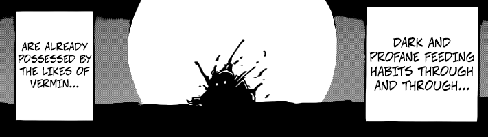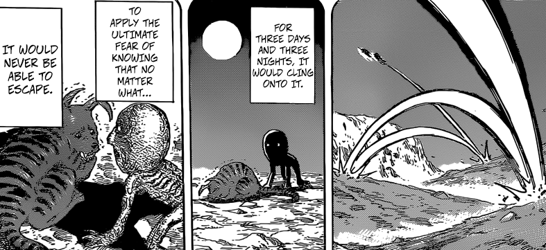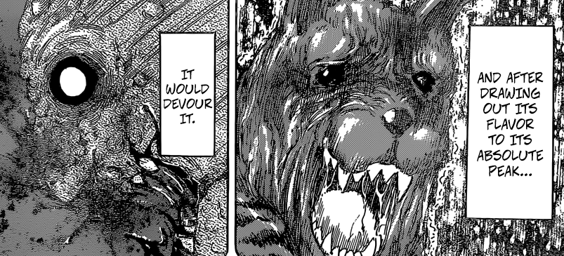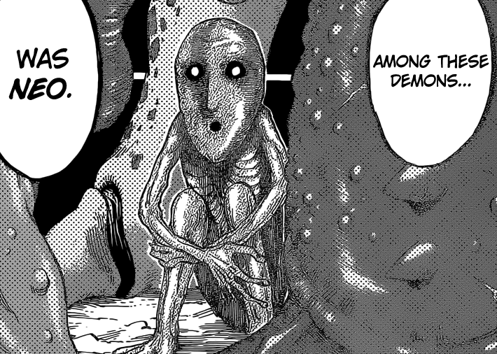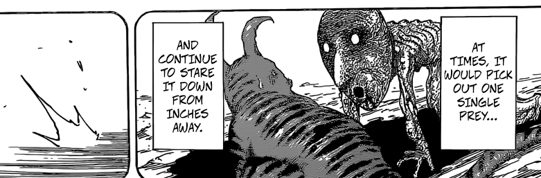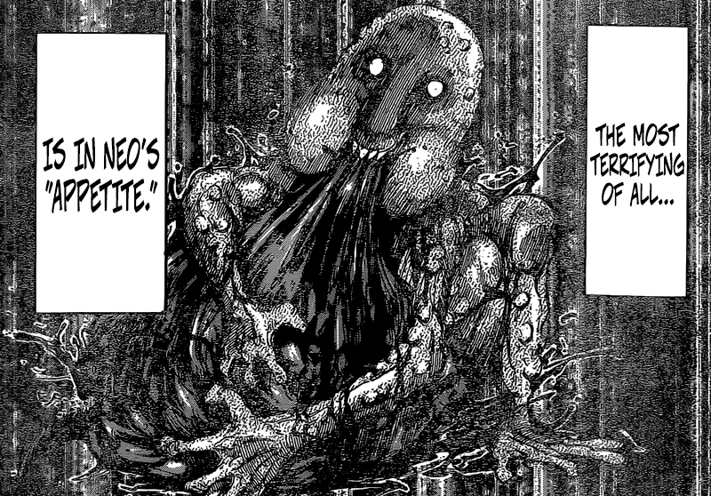 Oh, un bon chapitre ! Suffisamment rare pour être souligné ces temps-ci. Comme quoi Mitsutoshi a toujours a coeur de nous conter de « belles » histoires. Ou plutôt devrais-je dire, dans ce cas précis, une sacrée histoire d’horreur prompte à susciter des cauchemars tant la créature Neo s’avère être le démon incarné. Son plaisir ultime ? Traquer ses proies et les terroriser à l’extrême avant de les dévorer sans aucune forme de pitié. Son sadisme va jusqu’à poursuivre une proie plusieurs jours et nuits d’affilée jusqu’à ce que la peur atteigne son plus haut niveau. Saloperie de Neo <_<
