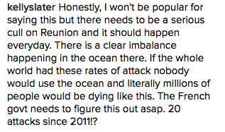 Ajoutez à ça le problème de la surpêche qui prive les squales de nourriture et les incite à déborder de plus en plus vers les côtes. Et donc vers l’homme. De fait, il s’agit d’un problème complexe et qui se doit d’être traité avec sérieux et humanisme. Notamment à l’égard de la cause animale. Or, ici, Kelly Slater appelle à un « rééquilibrage de l’océan » en procédant à un abattage massif des requins. Tout en nonobstant le fait que le drame ait eu lieu sur une zone plus que dangereuse —> Interdite ! C’est comme si quelqu’un se baladait à pied en safari au lieu d’être dans sa jeep et se faisait dévorer par un lion. Appelerions-nous à l’abattage des lions en vue de « rétablir l’équilibre de la savane » ? Je ne pense pas. Quoiqu’il en soit, des opérations d’abattage ont d’ores et déjà pris place autour de la plage de Saint-André et de la zone dans laquelle est mort le surfeur. Un requin s’est fait abattre mais il semblerait que ce ne soit pas le bon (trop petit).