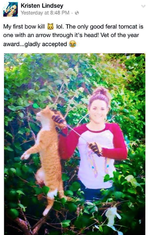 « Mon premier mort au tir à l’arc lol. Le seul bon chat de gouttière est un chat de gouttière avec une flèche dans la tête ! Award du vet de l’année…accepté avec plaisir xD ». Il y a des cas d’école, comme cette Kristen Lindsey, qui demeureront à jamais incompréhensibles. À savoir que la sociophathe est vétérinaire mais prend du plaisir à tuer des chats avec un arc pour ensuite poser fièrement avec sur son profil Facebook.