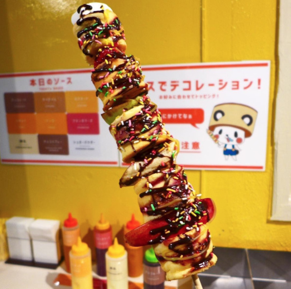Pour ma part, je pense que les Kushi Pancakes me rebutent en partie à cause des sticks ! Chaque fois que je me tape une brochette avec des amis, j’appréhende d’avoir à composer avec ce bâton en bois qui entre dans ma gorge x_x C’est hyper désagréable !! Il m’arrive même de me faire mal… Oui, je ne suis pas doué !! Anyway ! Pour celles et ceux qui seraient intéressés, vous pouvez trouver des Kushi Pancakes à Osaka et uniquement à Osaka xD Sachant qu’un stick comprend cinq morceaux de pancake et cinq morceaux de fruits/marshmallow ! Enfin, pour la formule de base ! Rien ne vous empêche d’augmenter le nombre de pièces et d’y rajouter le topping de votre choix (sauce chocolat, sauce chantilly, sirop d’érable, whatever) ! Je passe mon tour \^o^/