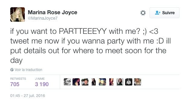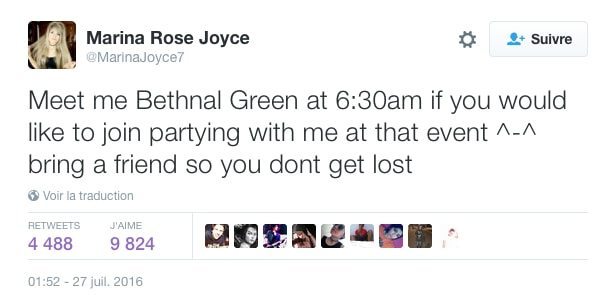 On croirait avoir affaire à l’un de ces films d’horreur où la victime est prisonnière d’un psychopathe prenant plaisir à lui faire jouer un rôle malsain au possible. Le pic de l’affaire est survenu hier soir lorsque Marina a invité ses fans sur Twitter à une fête dans le quartier londonien de Tower Halets à Bethnal Green. Une fête à 6h30 du matin dans un quartier réputé pour être assez craignos u_u C’est à cet instant que la police a été appelée et est intervenue au domicile de Marina —> « Rien à signaler. Allez voir ailleurs ».