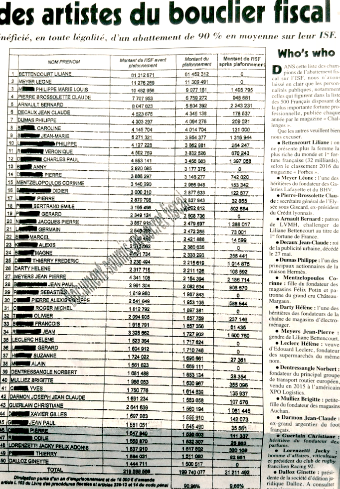 Comment éviter de payer l’Impôt sur la Fortune quand on est milliardaire ? Simple, demandez un abattement sur l’ISF généreusement pourvu par le gouvernement Hollande ! Soit ce rabattement qui permet aux contribuables les plus riches de France de bénéficier d’une grosse ristourne…voire de ne pas du tout s’acquitter de l’ISF. Ainsi la contribuable N°1 du classement, Liliane Bettencourt et ses 32 milliards d’euros, s’est-elle arrangée pour payer peanuts grâce à un astucieux montage d’optimisation fiscale. C’est beau la vie quand on est riche, non ?