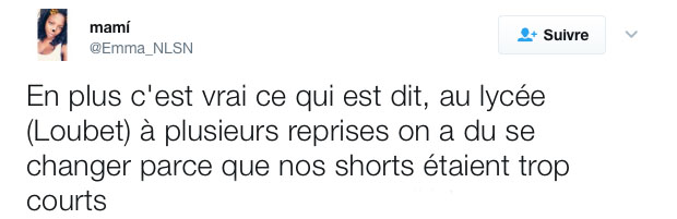 Notez que les shorts trop courts sont concernés par cette mesure et que les jeans troués sont également interdits (une simple fente aux genoux suffit) \^o^/ Et tout ça dure depuis des années… Il aura fallu un tweet pour qu’on s’interroge enfin sur les pratiques du lycée Loubet. Pourtant, la proviseure se défend de la moindre règle sexiste et se contente d’évoquer des « abus ». « Certaines viennent avec des jupes tellement courtes qu’on voit leurs culottes lorsqu’elles se baissent, c’est un souci de décence […] D’autres ont de tels trous dans leurs jeans qu’on voit toute la jambe ! ». Quant au maquillage, la directrice affirme faire entrer tout type d’élève. Qu’importe qu’ils aient « les cheveux verts ou bleus ». Mouais. Une manifestation est prévue pour le mardi 4 avril prochain (-‸ლ) Gogogogo (`0´)/