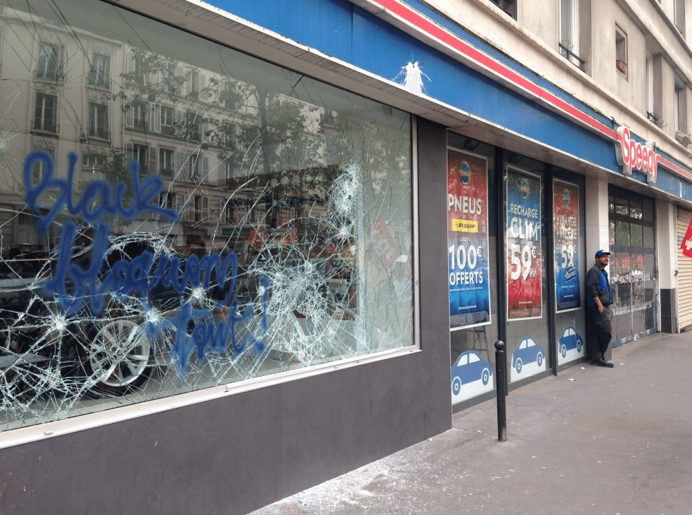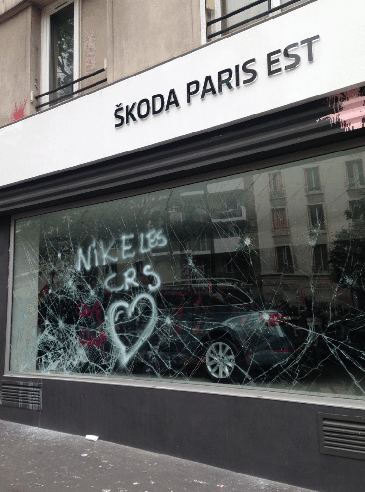 Pour autant, ceux-ci doivent continuer le mouvement tout en se désolidarisant des casseurs. Ce qui fut le cas lors de cette 8e journée de manifestation. Pour autant, les casseurs ont continué à faire parler d’eux en s’en prenant, outre aux officiers, à plusieurs commerces (banques, concessions d’automobiles, Franprix) u_u De même, certains faits de violence du coté policier et manifestants sont rapportés un peu partout à travers la France. Espérons que ces manifestations citoyennes parviendront à faire plier notre gouvernement. Lequel commence d’ailleurs à boursicoter autour d’un éventuel amendement de l’article 2 et sa hiérarchie des normes. Et plus le peuple sera uni dans la lutte contre ces accords d’entreprise donnant tout aux patrons et rien aux salariés, plus Valls et co seront forcés à faire marche arrière.