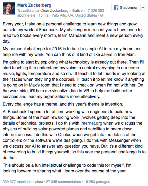 Le fondateur de Facebook souhaiterait une IA similaire à celle de Iron Man —> Jarvis. Réalise t-il que si ça arrive, la dite intelligence artificielle finira par se rebeller contre lui ? Soit en le tuant (classique), soit en prenant possession de son corps via nanotechnologies agissant au niveau des cellules neurales (plus probable) <_< Et oui, il ne faut pas plaisanter avec ces choses-là ! Anyway, l’intelligence artificielle, la vraie, celle qui parviendra à égaler l’intellect humain puis à le surpasser, est désormais en marche. Et ce n’est qu’une question d’années avant d’être témoin d’une véritable révolution technologique.