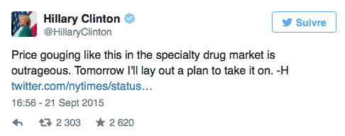 Or, sachant que le Daraprim n’a pas d’alternative générique et n’est toujours pas tombé dans le domaine public, les patients n’ont d’autre choix que de se le procurer s’ils veulent pouvoir vivre sans souffrir…voire vivre tout court. Fort heureusement, et parce qu’on ne vit pas (encore) dans une société 100% capitaliste, une enquête fédérale a été lancée contre le gugus pour « activités financières illégales » et une certaine Hillary Clinton a décidé de s’emparer du dossier afin de vite faire redescendre sur terre Martin Shrek. Lequel n’en serait pas à son coup d’essai. Tête de rat.