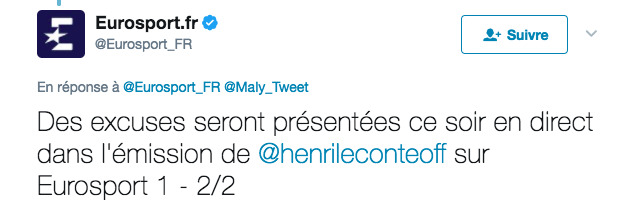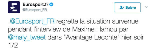 « Si ce n’était pas du direct, je lui aurais collé une droite ». Maly Thomas, la journaliste sportive concernée, ne décolère pas. Tout en souhaitant ne pas faire de cette histoire une affaire d’état. Pourtant, il y a de quoi —> Le comportement de débile profond de Maxime Hamou prouve à nouveau combien la culture du viol est présente en 2017. Comment est-il possible qu’un esprit bien construit ne puisse pas comprendre qu’embrasser de force une femme n’est pas correct (et illégal) ? D’autant plus que l’acte est répété. Et diffusé en direct sur Eurosport sous l’indifférence générale des présentateurs. La chaine a d’ailleurs fait savoir que ces derniers présenteraient leurs excuses. Pour ne pas avoir réagi comme il faut (cf les rires). Très bien. Sauf que le premier concerné, à savoir Maxime Hamou, n’est pas mentionné. D’ailleurs, au vu de la vidéo, on voit que son comportement à l’égard de Maly Thomas est tout à fait assumé.