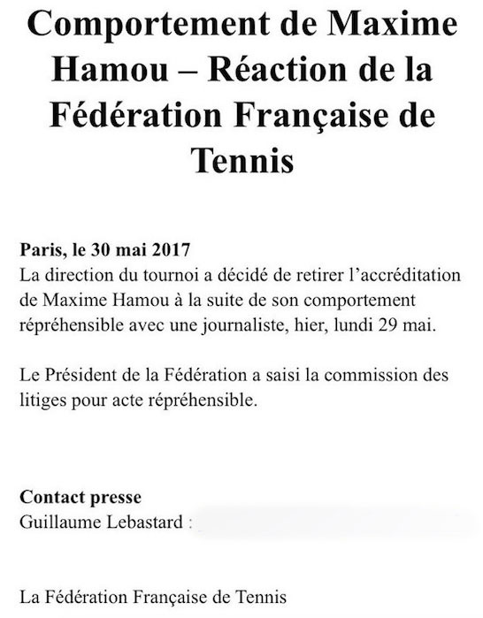 À cet égard, certains internautes ne comprennent pas cette affaire. Pourquoi qualifier d’agression sexuelle le fait d’embrasser de force quelqu’un ? Au pire, il s’agit d’une « déconnade » ou d’une « mauvaise plaisanterie » ! Rien de grave ! Le consentement de la victime n’est pas « si important » que ça ! Tant qu’il n’y a pas pénétration… Damn. Heureusement que nous sommes de moins en moins à avoir cette mentalité d’arriéré. Le pire, c’est quand je vois des femmes prendre la défense de Maxime Hamou ._. C’est dans ce type de moment que je me dis qu’il y a encore un long travail à faire ! Pour autant, on avance. La preuve —> La Fédération Française de Tennis vient de retirer son accréditation à Maxime Hamou ! Pour son comportement de cassos fini ^o^ Ça lui fera les pieds ! Histoire qu’il puisse réfléchir comme il faut. Il n’est pas trop tard pour devenir un homme respectable. Espérons que cet acte fort envoie un signal à tous les hommes coincés à la préhistoire. Il est temps d’évoluer.