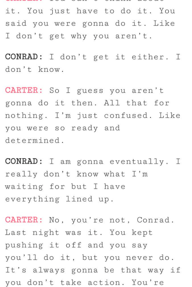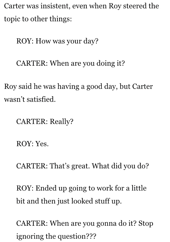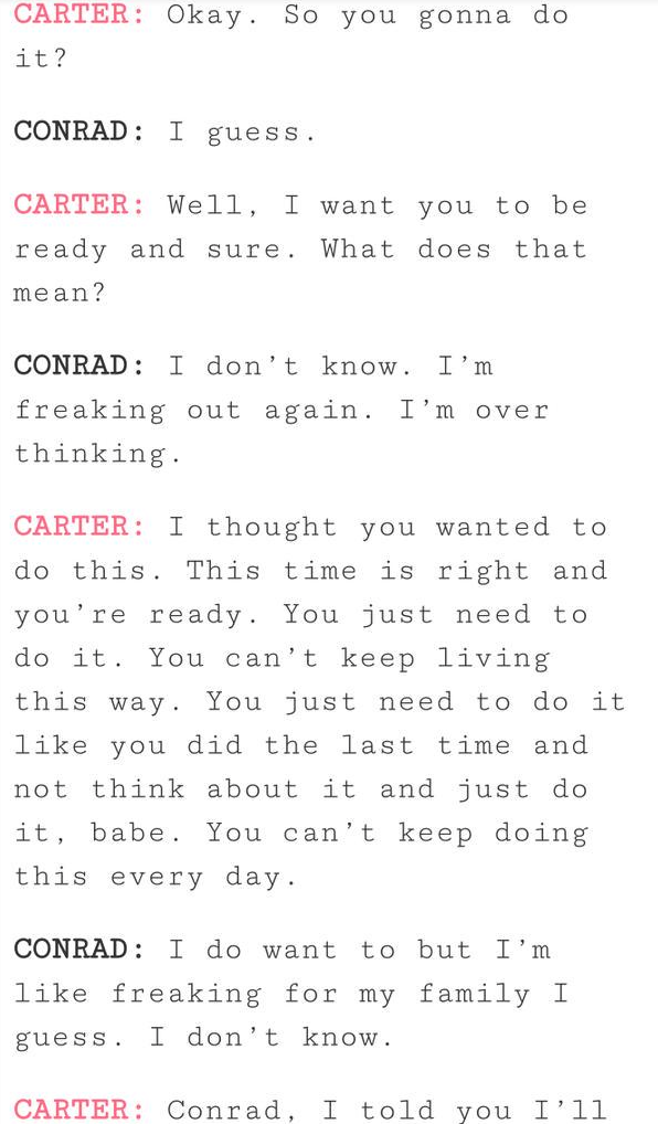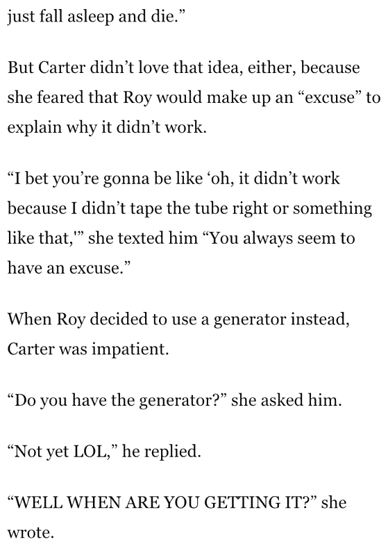 Pour renforcer ses arguments, celui-ci rajoute même que Carter voulait initialement se suicider avec Michelle. Mais celle-ci a maintes et maintes fois refusé. Ok, soit. Il n’empêche que cette fille a un gros problème mental et doit être sévèrement punie pour ce qu’elle a fait. Inciter un petit ami qui va mal à se suicider ? Le pousser à l’action même lorsqu’il y renonce ? Dans quelle réalité est-ce que ce genre de comportement est attribué à un lavage de cerveaux ? Oui, il avait ses propres problèmes mais se mettre en couple avec une psychopathe ne l’a définitivement pas aidé. Mes pensées à Conrad et à sa famille. Il faut qu’elle paye.