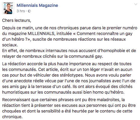 Plus sérieusement —> Pourquoi avoir pondu un tel article ? Peut-être pour faire un bad buzz histoire qu’on parle d’eux. De ce point de vue, c’est réussi ! Ça leur permettra peut-être d’écouler un peu plus de numéros… Puis rien à voir mais—> Qui sort encore des magazines en 2017 ? De base, il y a une erreur stratégique ! Mais confondre « Hétéro » avec « Beauf » puis « Gay » avec « Mec qui n’aime pas le foot et préfère la compagnie féminine » est une erreur tout court. Au moins ont-ils précisé que c’était à « prendre avec humour ». Il aurait juste fallu le préciser DANS l’article. Enfin ! La rédaction de Millennials Magazine s’est excusée sur sa fanpage et a concédé la maladresse du pavé u_u Débat clos en ce qui me concerne ^_^