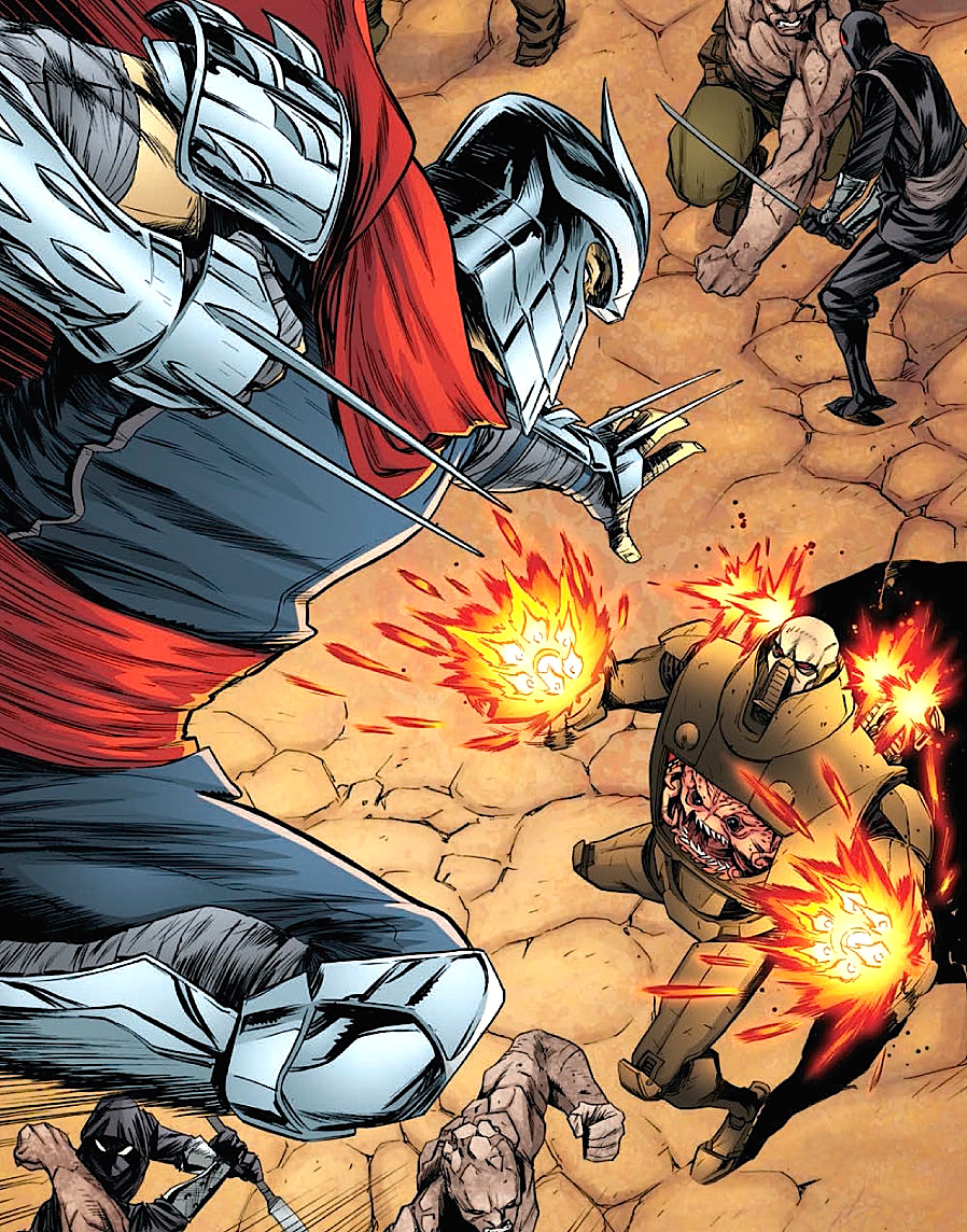 Seulement voilà, le sinistre personnage va profiter de cette occasion pour envoyer ses deux meilleurs soldats s’occuper de Donatello. Lequel tente bien de se défendre en faisant appel au robot Metalhead mais en vain : Rocksteady (le Rhino) lui assène un violent coup de massue qui perce sa carapace et le tue sur le coup. C’est assez violent ce qu’il vient de se passer ._. Je me demande si la suite ciné des Tortues Ninja s’en inspirera…