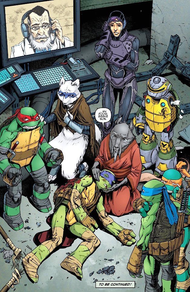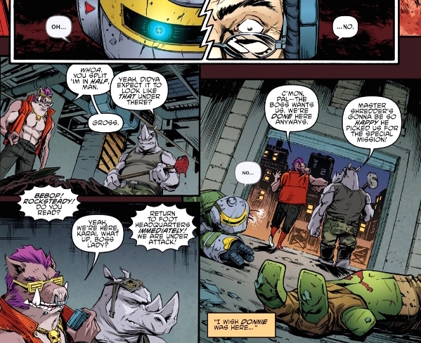 Ils ont osé O_O Heureusement, il ne s’agit pas de ma tortue ninja préférée (Raphael) <_< Il n’empêche que ça fait mal au coeur d’apprendre la mort de (SPOILER ALERT) l’informaticien de la bande…aka Donatello. C’est lors du dernier numéro de la bande dessinée que Donnie, suite à une attaque surprise de Beppo et Rocksteady à même le QG, succombe à ses blessures. Raphael, Leonardo et Michelangelo ? Sur le terrain en train d’affronter Krang et son armée….aux cotés de Shredder.