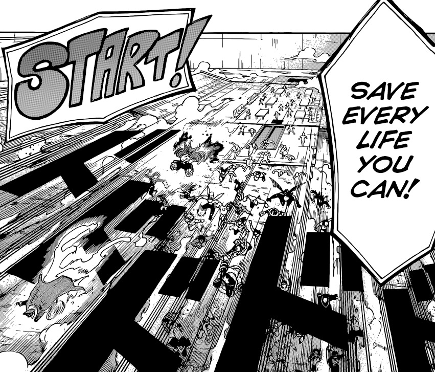 Le round 2 peut commencer (`0´)/ Objectif : Analyser l’environnement d’un quartier venant de subir une attaque terroriste et mettre en place une stratégie optimale en vue de secourir un maximum de citoyens (-‸ლ) Voilà un domaine pour lequel la Seconde A n’est pas encore au point -_-‘ Contrairement aux situations de combat qui, soyons francs, ont trusté la centaine de chapitres jusqu’alors xD Avec quelques variations (encore heureux) ! Mais comment vont se débrouiller Deku et co face à des victimes en danger de mort ? Comment donner la priorité à telle ou telle personne ? Que leur dire pour qu’elles ne paniquent plus ? Que faire lorsque la situation devient critique à un point tel qu’il n’y a rien plus à faire ? Voilà toutes sortes de scénarios avec lesquelles nos héros vont devoir composer !