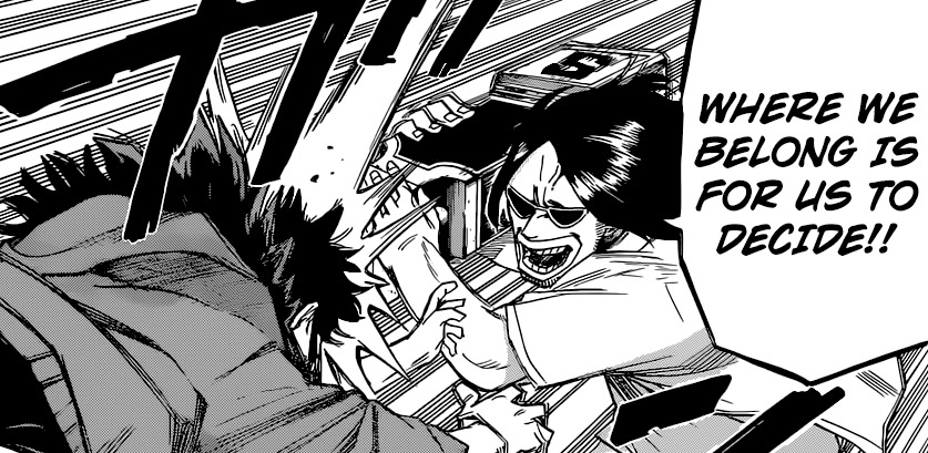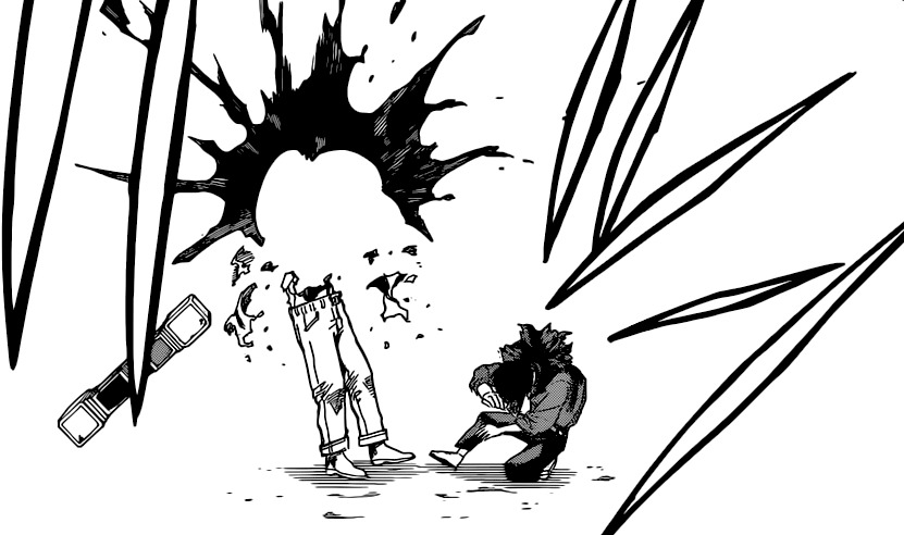 Popopopopo !!! Ce chapitre O_O Je ne m’attendais vraiment pas à un tel retournement de situation ! D’abord Yakuza qui fait preuve de bon sens en expliquant à Tomura que son organisation manque singulièrement de structure. Puis son deal —> « Faites de moi votre leader et je vous apporterai les financements et l’assise nécessaire pour impacter le monde de demain ». Évidemment, Tomura refuse derechef et Magne, l’un de ses sbires, prend l’initiative d’attaquer le jeune leader des 8 Préceptes de la Mort 8 Et c’est après un court flashback que notre ami…explose dans une mare de sang ._. Je n’ai tellement rien compris qu’il m’a fallu que je revienne en arrière xD Dingue comment Kohei Horikoshi a développé l’embryon d’un character building pour Magne avant de le faire tuer de manière aussi expéditive !
