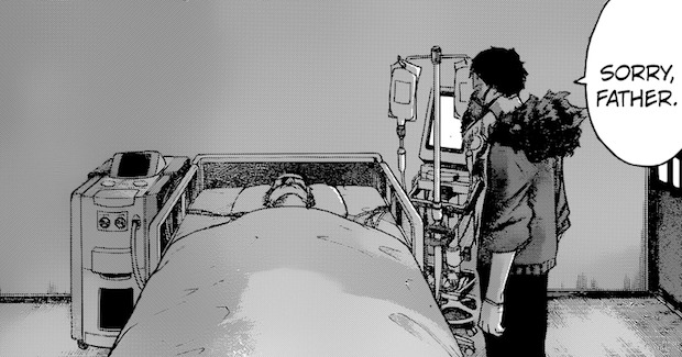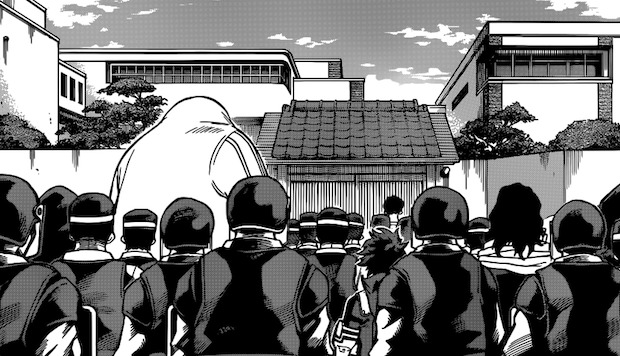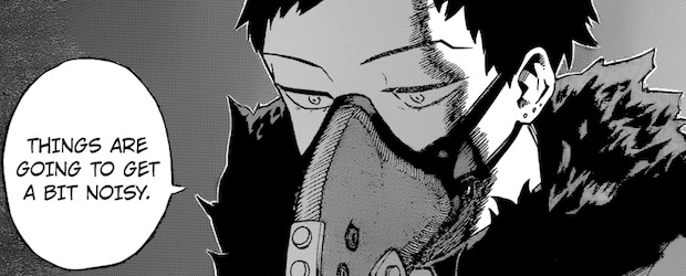Les pions de Chisaki a.k.a. Overhaul… Le type n’assume tellement pas ses mauvaises actions qu’il leur fait porter des masques afin de ne pas avoir à sentir leur « mauvaise odeur » u_u Parce qu’ils agissent en dehors de la loi et commettent toutes sortes d’actes répréhensibles. Le mec -_-‘ Je me demande s’il se fera attraper ! M’est avis que non —> Son personnage a fait l’objet d’un character building bien trop dense pour être mis si vite aux oubliettes ! Quoique, Slain avait eu un développement intéressant mais ça ne l’a pas de se faire battre en deux tomes xD Ceci-dit, mon petit doigt me dit que nous sommes loin d’en avoir fini avec Slain ! Ses idéaux extrêmes de vertu héroïque pourrait même persuader les autorités à l’enrôler provisoirement du coté des héros ! Mais revenons à notre opération de sauvetage !!