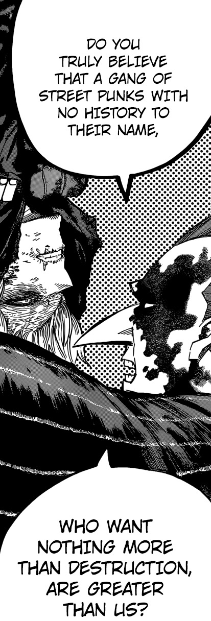 Seulement, aux yeux de Destro, les mots de sa mère et sa volonté première ne furent absolument pas respectés. Si ce n’est être utilisés en tant que slogans dans des campagnes politiques. De fait, personne n’est autorisé à utilisé son alter comme il le souhaite sans intégrer L’Association des Héros et en accepter les règles. « Si les masses ne peuvent pas utiliser leurs quirks comme elles le veulent, la libération ultime n’aura jamais lieu » crie Destro alors que le clone de Shigaraki tente de le toucher. Et bien ! Ce chapitre dédié aux origines du quirk fut instructif. Le fait que Chikara Yotsubachi soit le descendant de Destro me laisse espérer qu’il ne sera pas qu’un apéritif eu égard à Tomura mais bel et bien un méchant à part entière. Ceci-dit, avec l’arrivée imminente de Gigantomachia, je me demande comment lui et L’Armée de la Libération vont survivre. Allez, la suite !
