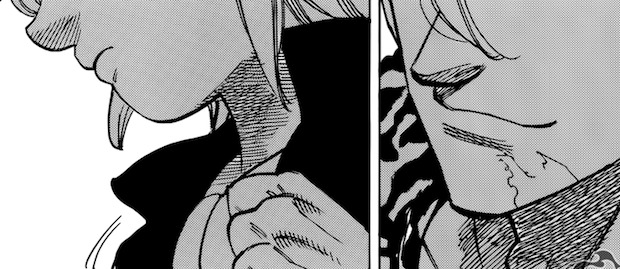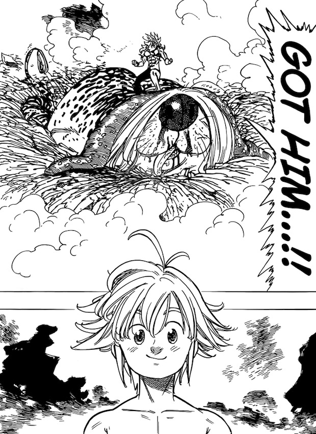 La Bromance Ban X Meliodas à son paroxysme ! Et ça fait plaisir à voir ! D’autant plus que Meliodas se retrouve totalement sans défense cette fois-ci. Jusqu’au point d’abandonner tout espoir de s’échapper un jour du purgatoire. Forcément –> Son père, le Roi Démon, s’est arrangé pour rendre toute tentative d’évasion impossible. Qui plus est, Meliodas n’a aucune force. Le « soi » dont il dispose au Purgatoire est composé de ses sentiments et non pas de sa force physique. Tout le contraire du Meliodas de Britannia. Celui qui, d’ici peu, pourrait devenir le prochain Roi Démon ! C’est d’ailleurs l’objectif du Roi actuel ! Mais pourquoi ? Peut-être parce qu’il veut quitter le Purgatoire. J’avais cru comprendre que sa forme actuelle était beaucoup trop puissante pour conserver une enveloppe tangible dans le monde réel. D’où l’intérêt d’échanger sa place avec le fils ainé… Les retrouvailles risquent d’être chaleureuses ! Peut-être qu’avec le power-up de Ban, celui-ci sera capable d’utiliser Fox Hunt sur le Big Boss ! Ce qui leur permettrait de s’échapper… Ensuite ? Retrouver Dark Meliodas et le faire fusionner avec ses émotions perdues !